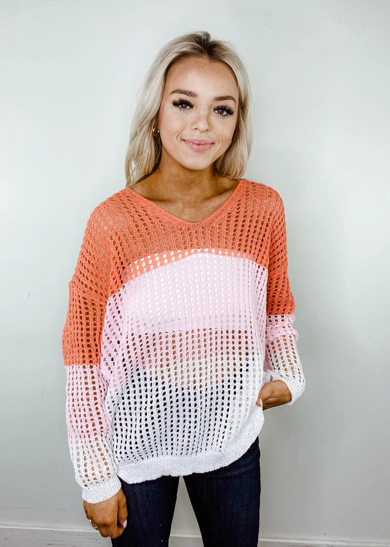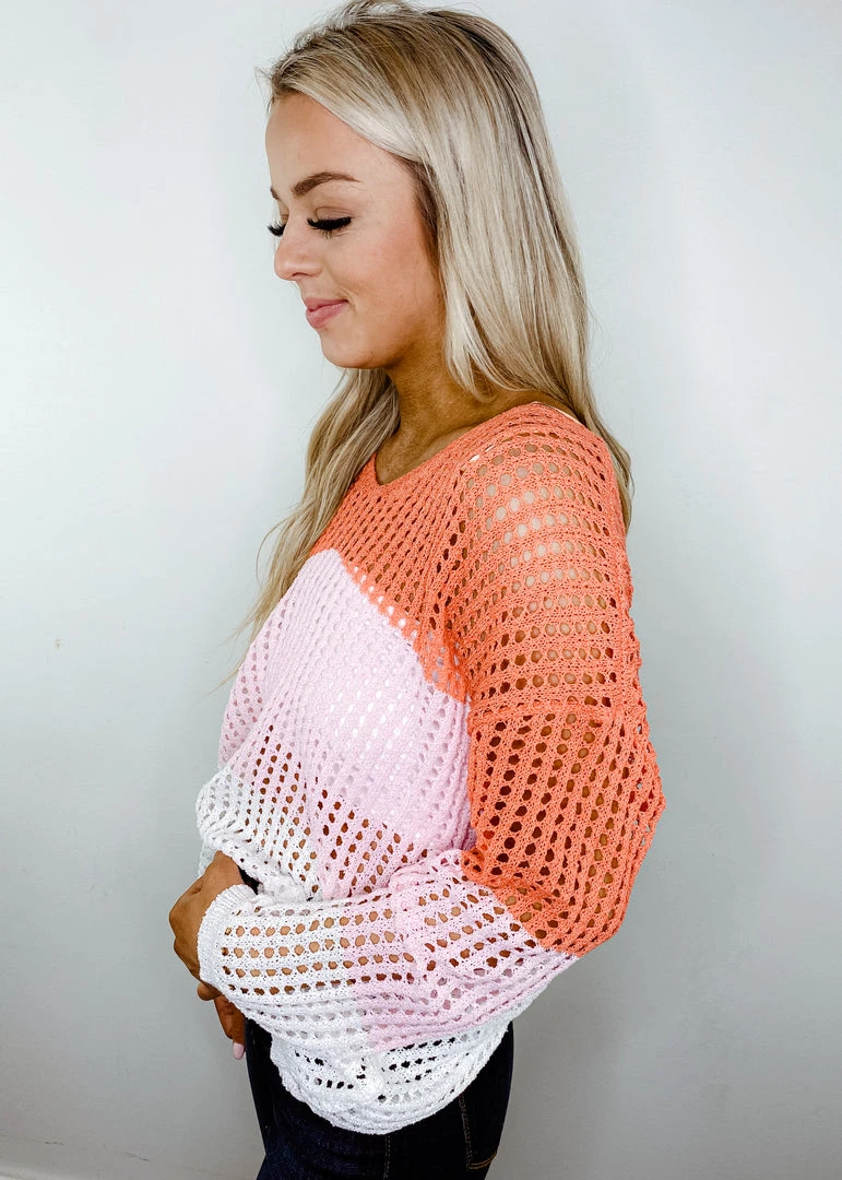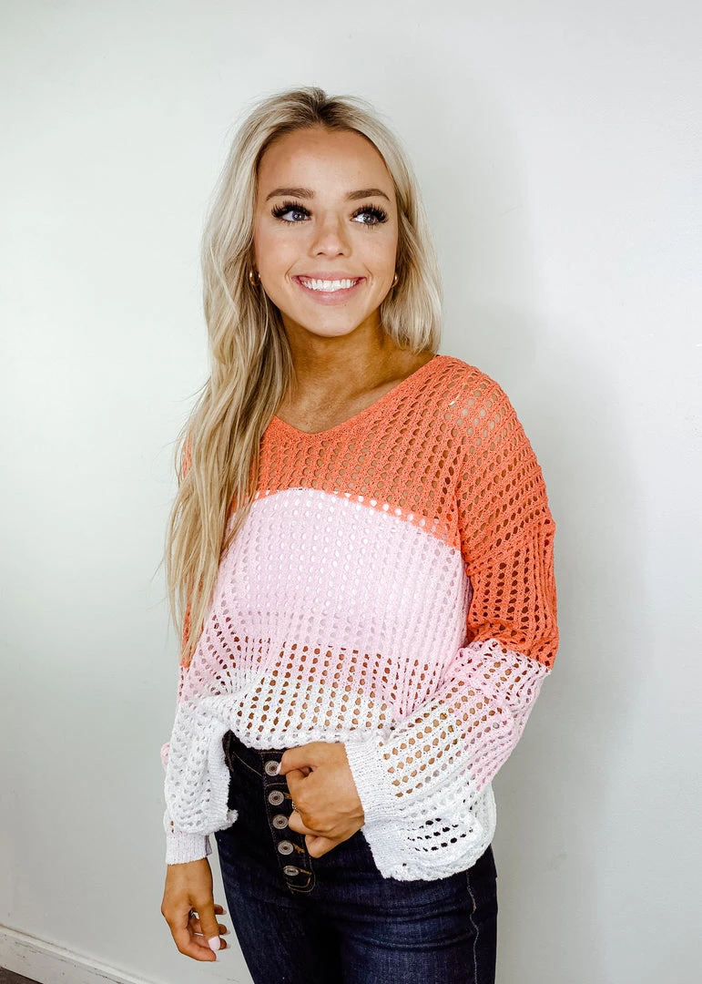 143 Story Tops Kat Colorblock Open Knit Sweater | Women’s Long Sleeve Casual Pullover