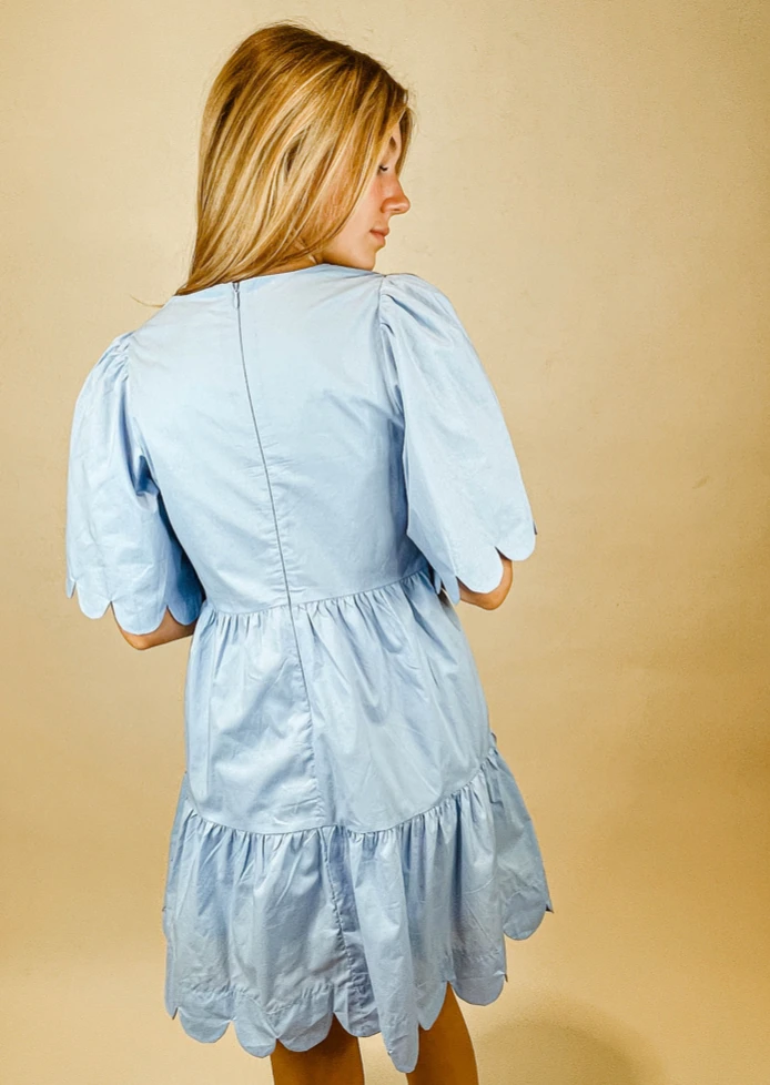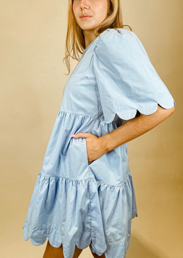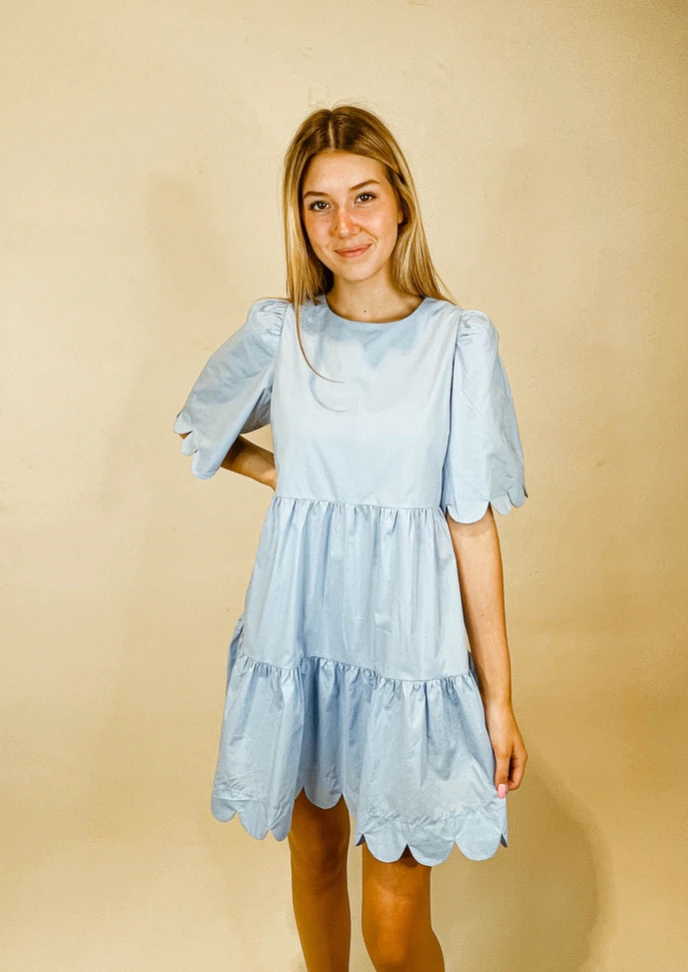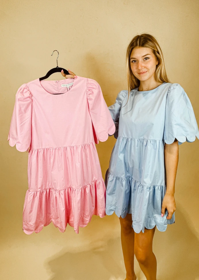 Who else is obsessed with a scallop hem this summer? The Charlotte Scallop Hem Dress features a scallop hem, short sleeves, a flattering tiered ruffle silhouette, and a zipper closure on the back. We recommend pairing the Charlotte dress with your favorite accessories and strappy sandals!