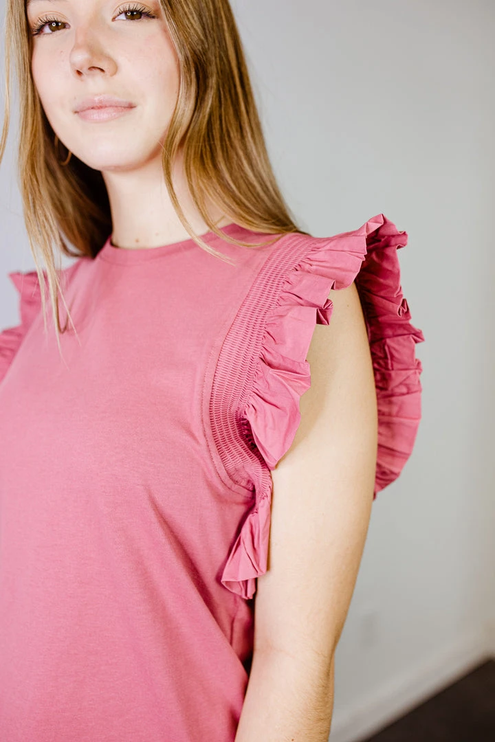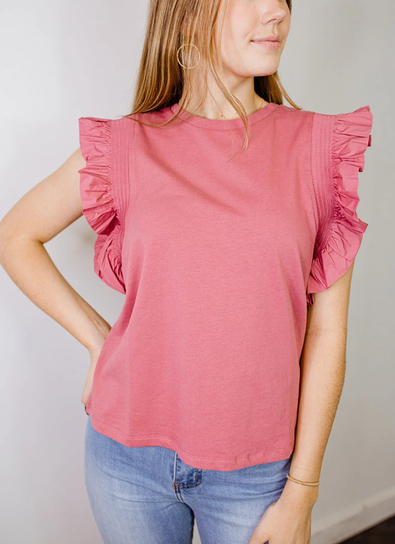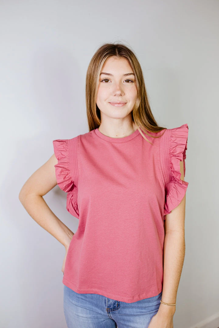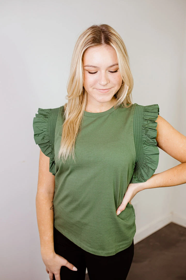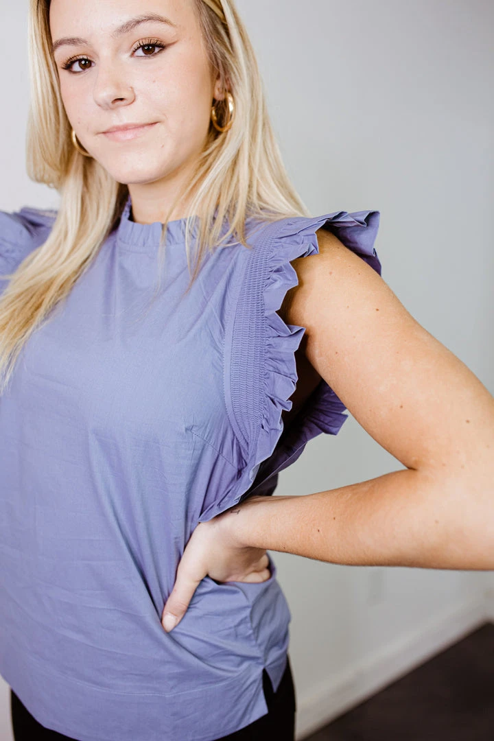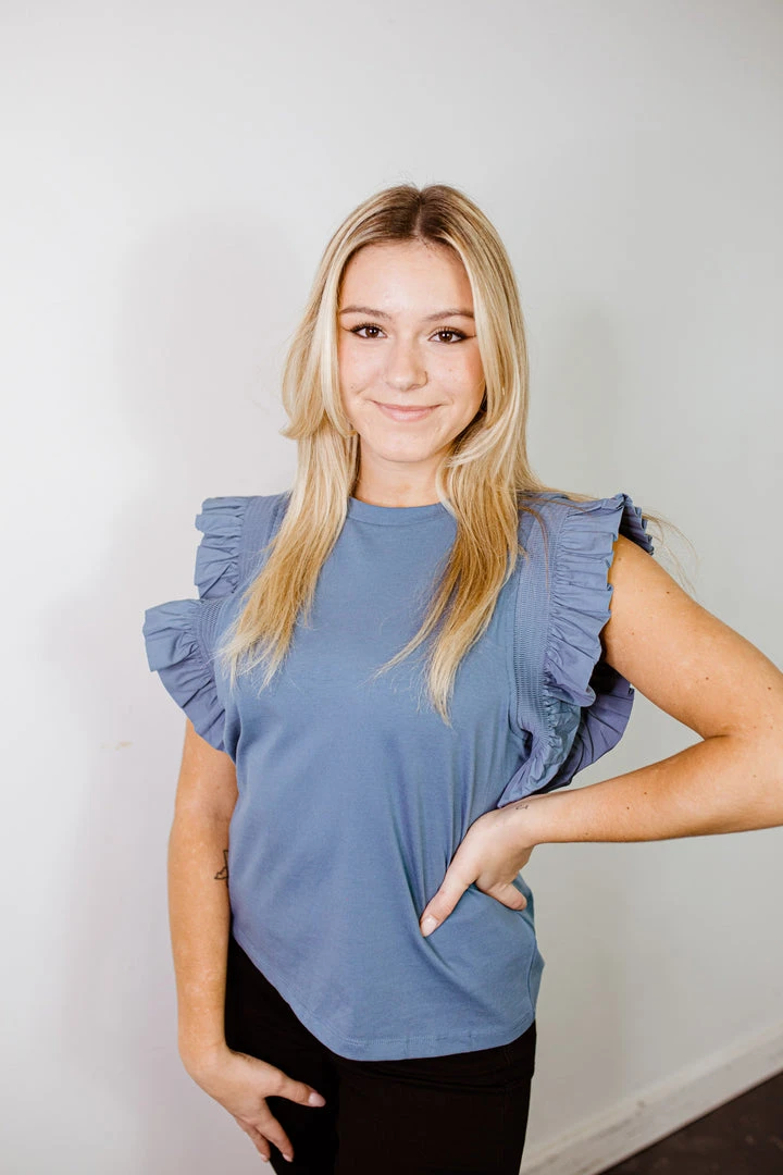 - Crafted from high-quality, breathable fabric, the Keaton Ruffle Sleeve Top ensures all-day comfort while maintaining a polished look. Ideal for layering or wearing on its own.