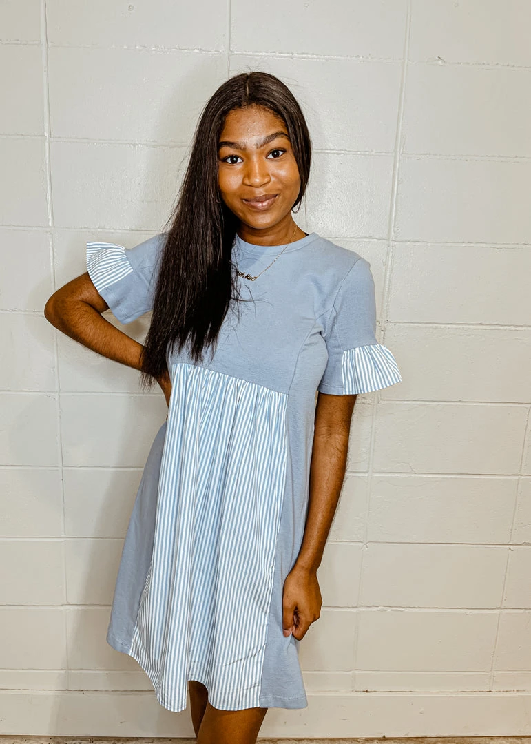 The English Factory Marilyn dress features short sleeves with a ruffle hem, contrast striped accents, pockets at the side, and a flattering fit. Easily dress the Marilyn Striped Dress up or down for any upcoming occasion!Â