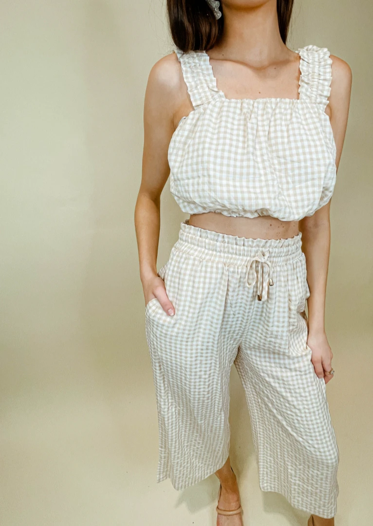 The Piper Gingham Cropped Pants feature an all over classic gingham pattern, a high rise elastic waist with an adjustable drawstring tie, pockets at the side, and a cropped length. Pair with the matching Piper Gingham Bubble Top!