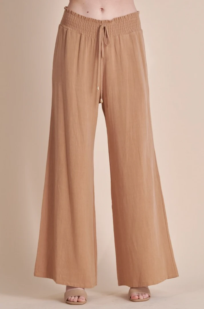 The Seaside Linen Pants are a must have for your next beach trip! The Seaside pants feature a high rise smocked waist with a drawstring and a flowy, wide leg silhouette. These pants are a super lightweight linen fabric – perfect for summer! We will be pairing the Seaside Linen Pants with the matching Seaside Linen Tank Top!Â