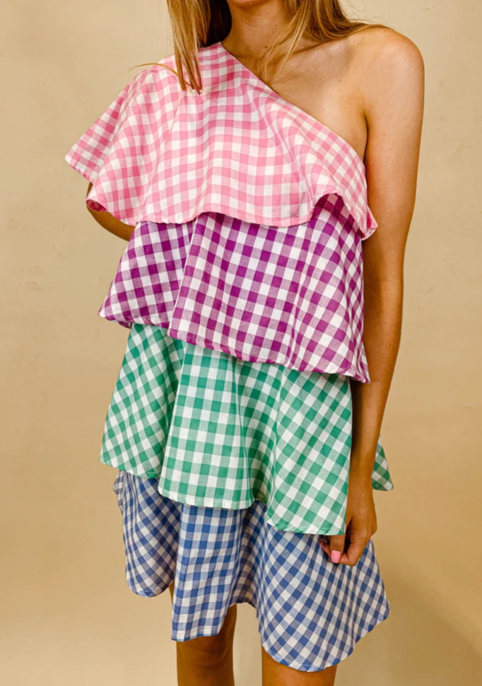 The Lana One Shoulder Dress was instantly a Swank favorite! This dress features a flattering one shoulder neckline, multi color gingham pattern, and a flowy layered ruffle silhouette. Pair the Lana dress with trendy, colorful accessories and fun strappy shoes.Â
