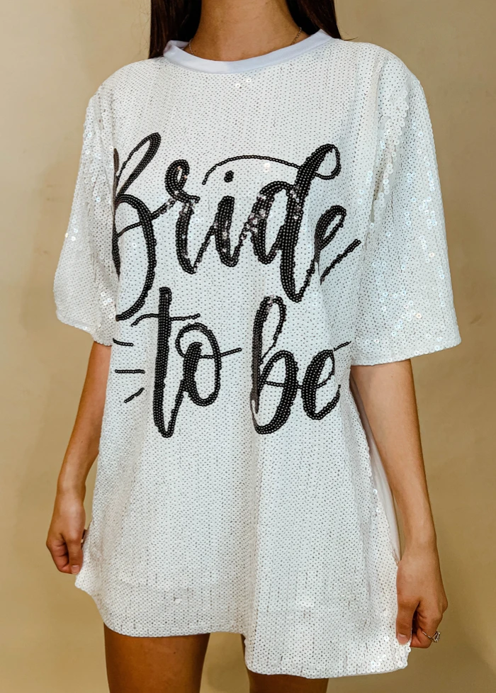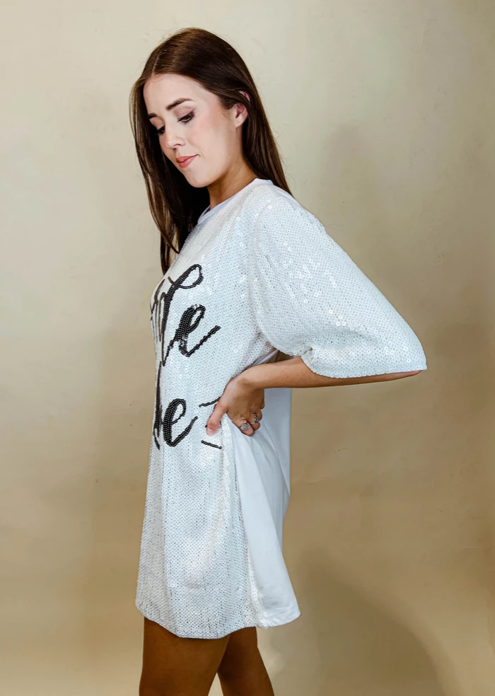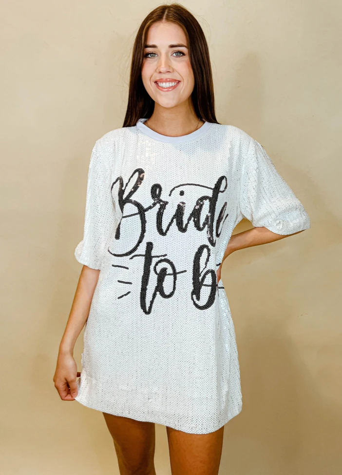 Calling all future brides! Make a statement at any bachelorette party or bridal event in the Bride to Be Sequin Dress. This dress is one size and it features a relaxed tee shirt silhouette and all over white sequins. Pair with fun accessories and strappy sandals or sneakers.