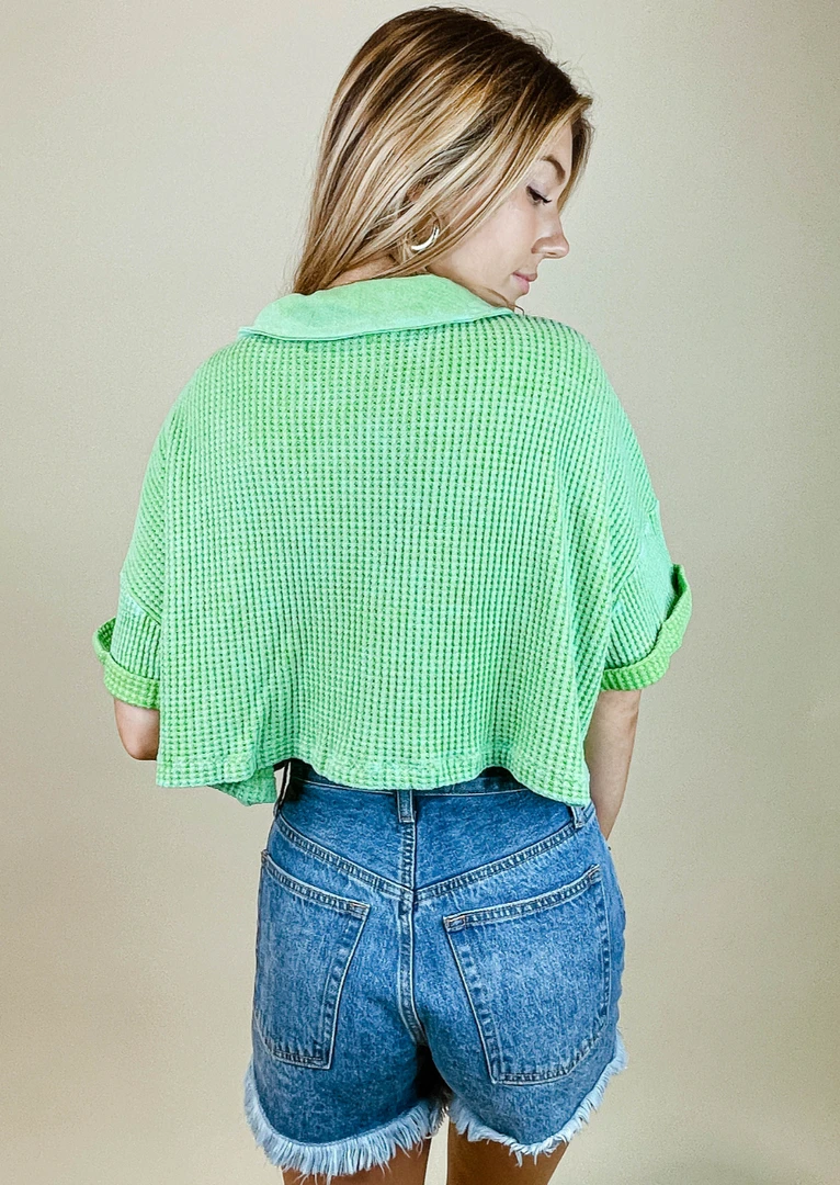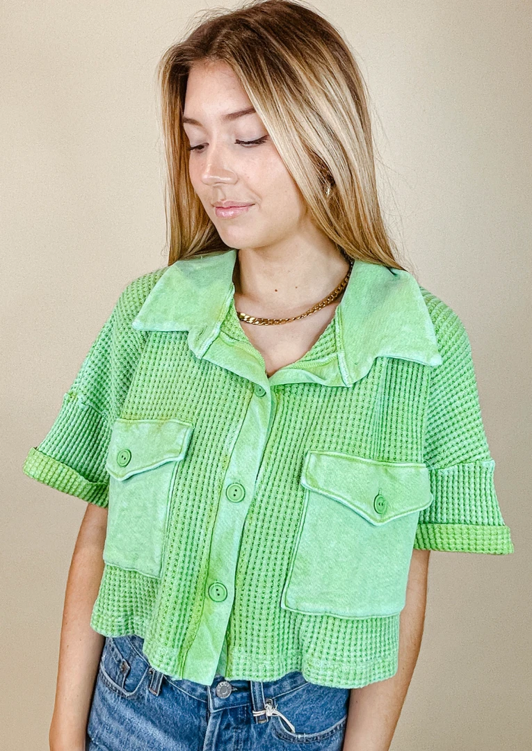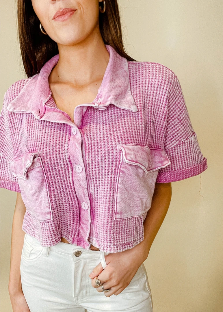 The Lee Waffle Knit Top is perfect for the spring and summer transition season! The Lee top features a collar at the neckline, button down front, two utility pockets on the chest, short sleeves, and a relaxed, cropped fit. We will be pairing the Lee top with our favorite high waisted denim shorts.Â