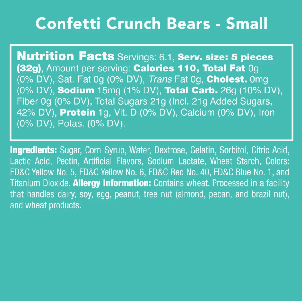 - Packaged in a stylish and resealable bag, Candy Club Confetti Crunch Bears are ideal for sharing or enjoying on the go. Their eye-catching colors and fun texture make them a standout addition to any candy collection.