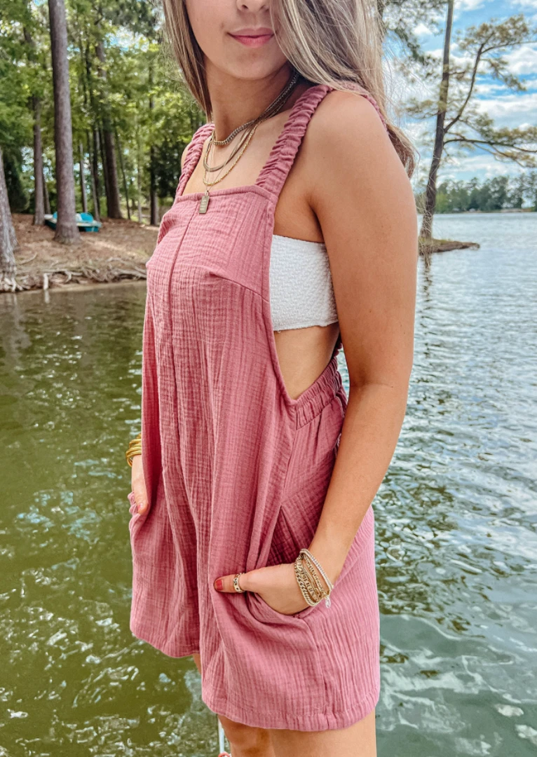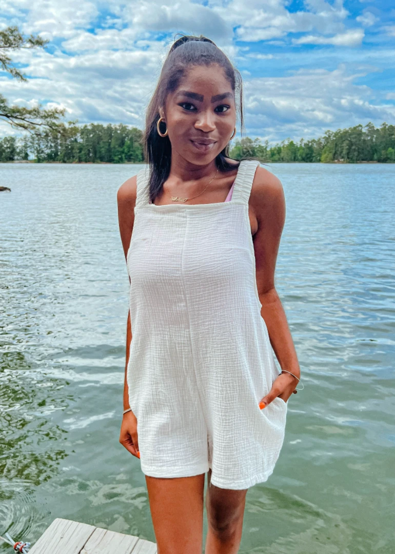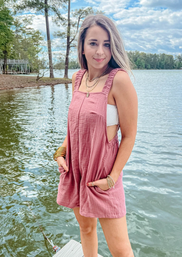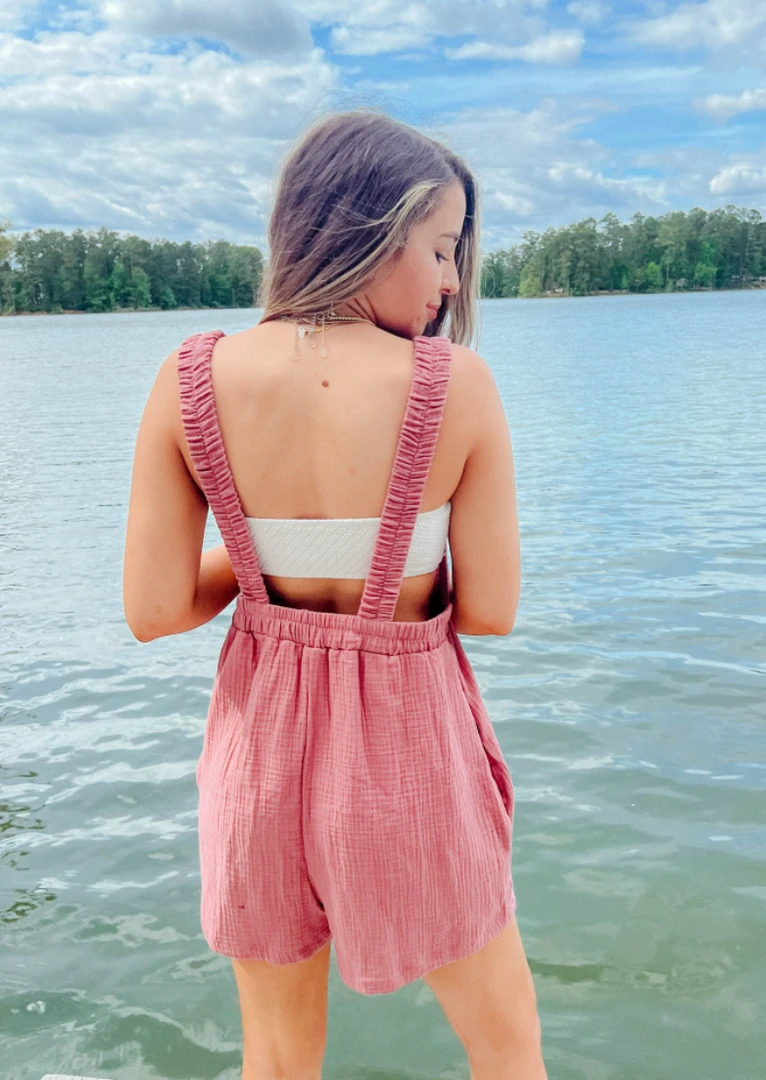 The Delray Cotton Romper will be a must have for all of our upcoming beach and pool days! The Delray romper is a breathable, lightweight cotton. This romper features a sleeveless silhouette elasticized shoulder straps, an open back, pockets at the side, and a relaxed fit. Perfect to wear as a bathing suit cover up!