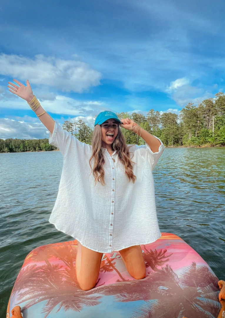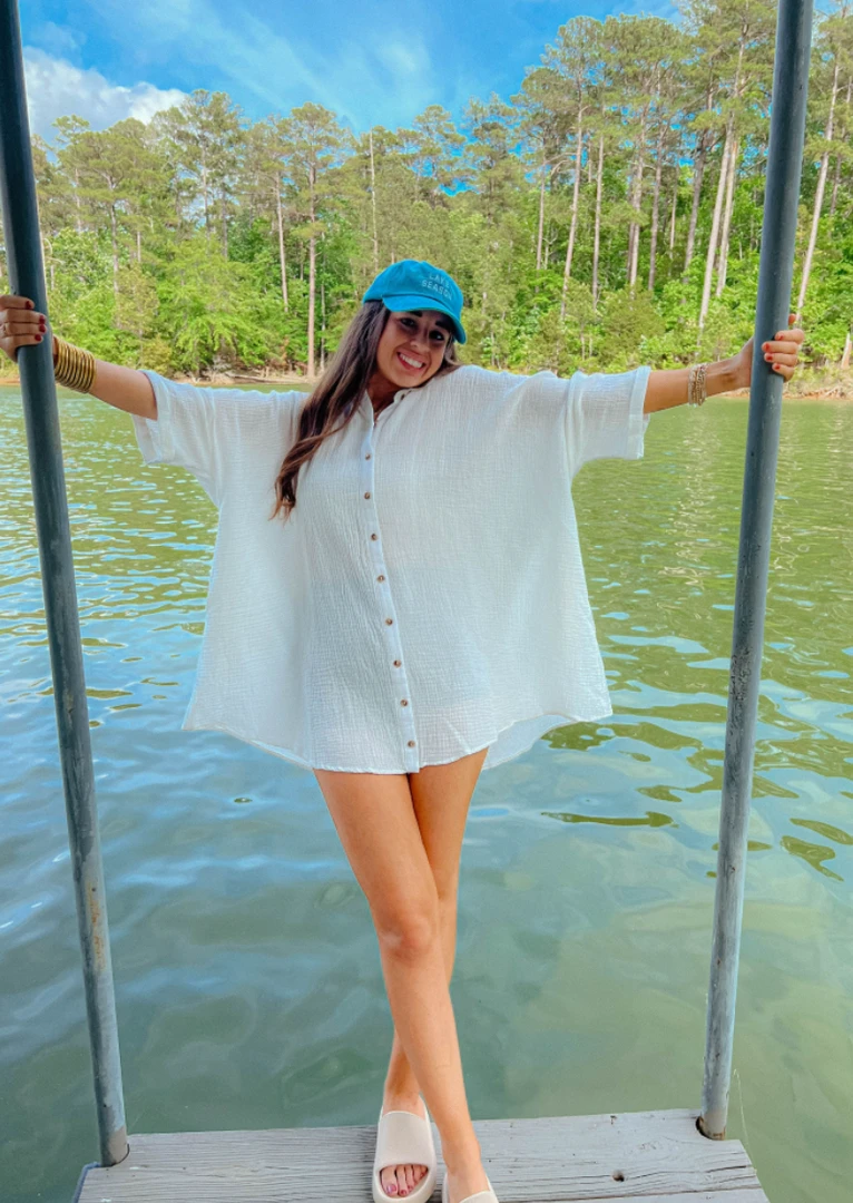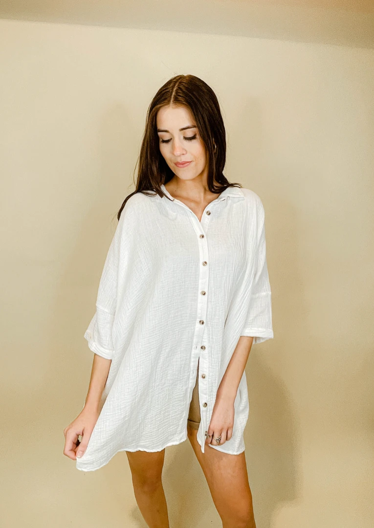 The West Palm Oversized Shirt is giving us all of the summer vibes! The West Palm top is a lightweight, breathable cotton fabric. This top features a collar at the neckline, button up front, drop shoulder short sleeves, pockets, and an oversized fit. Perfect to wear as a bathing suit cover up!