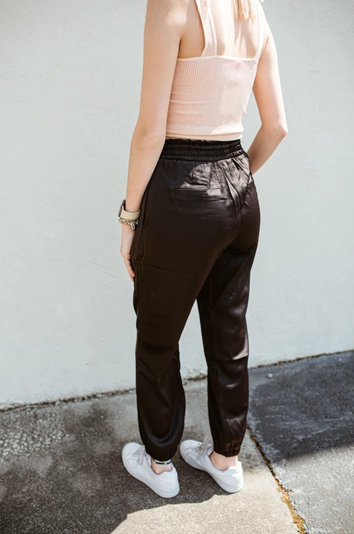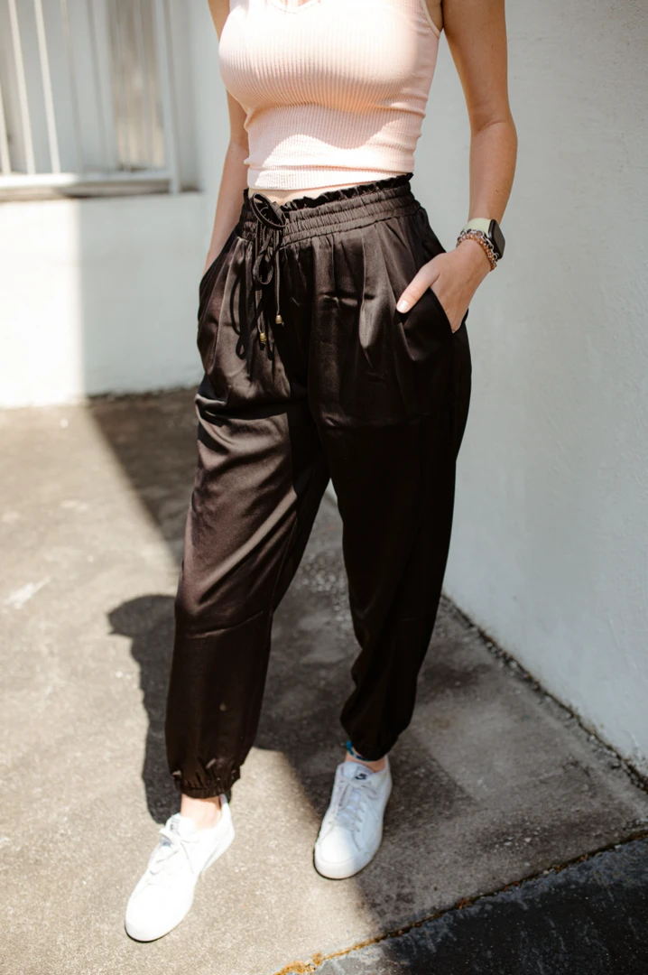 - Experience ultimate comfort with the Entro Colleen Solid Satin Joggers Bottoms. Made from high-quality satin fabric, these joggers are perfect for lounging or casual outings.