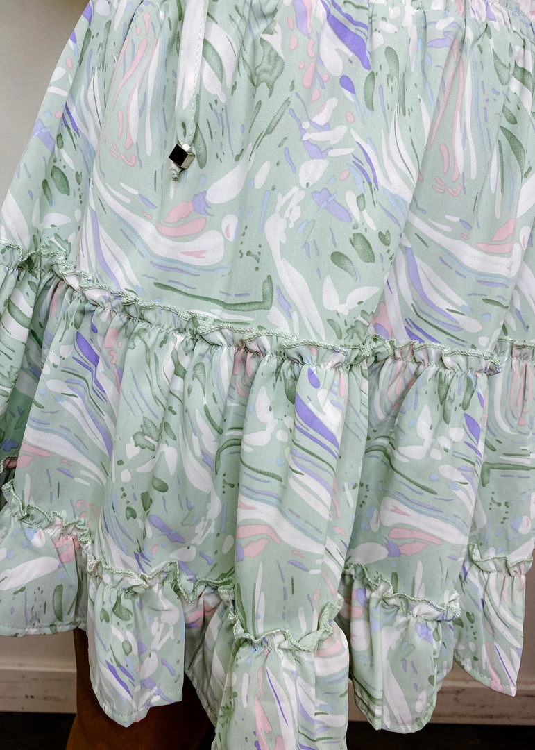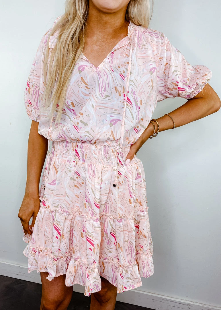The Melanie dress features a colorful abstract pattern, short puff sleeves, a flattering v neckline with a self tie closure, smocking at the waist, and a tiered ruffle skirt. You can easily dress the Melanie dress up or down for any occasion. Pair this dress with sneakers and a denim jacket to create a more casual look. You can also wear the Melanie dress with strappy shoes and fun, statement accessories to dress it up. This dress is lined, woven, and super lightweight.Â