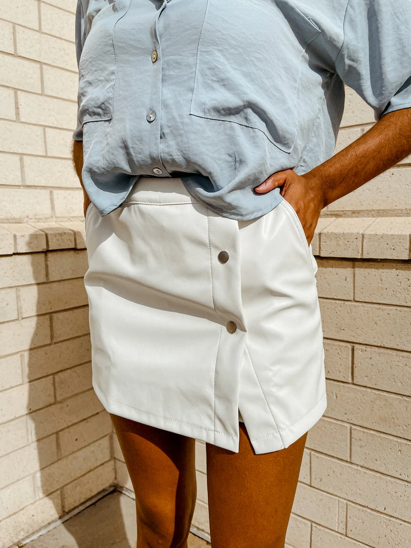 The Magnolia faux leather skirt features a high rise waist, a button down detail on the front, pockets at the side, and a super flattering silhouette. You will be reaching for the Magnolia skort over and over again this season… easily dress it up or dress it down for any occasion!