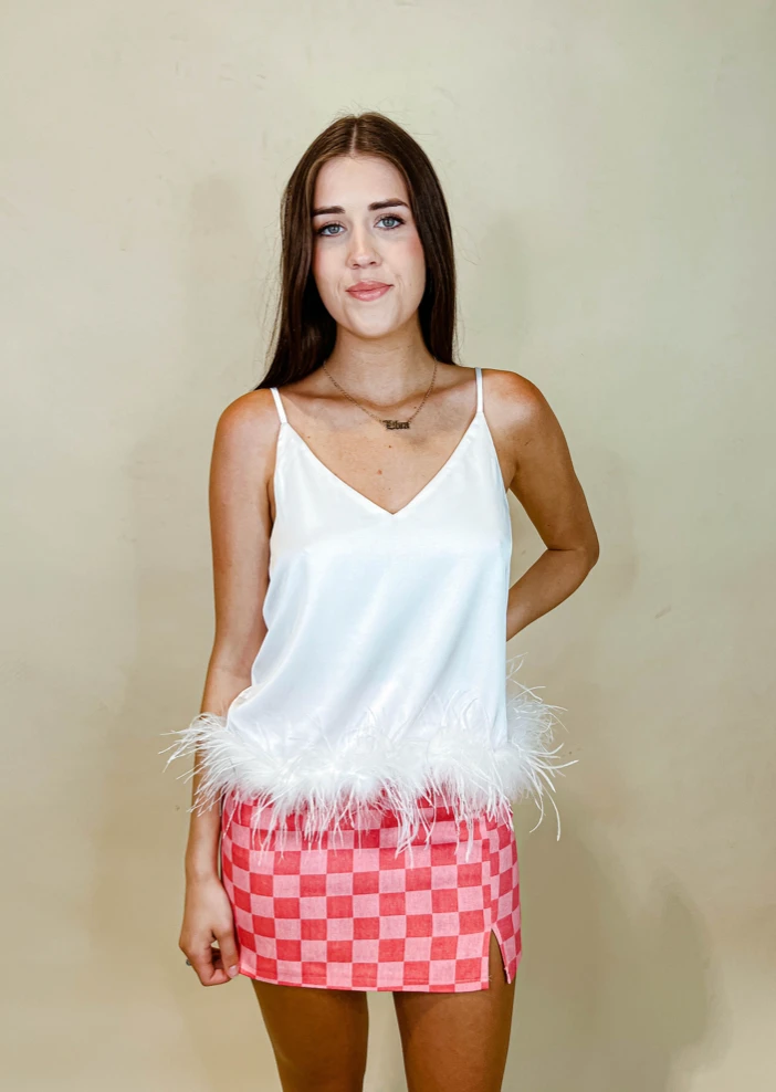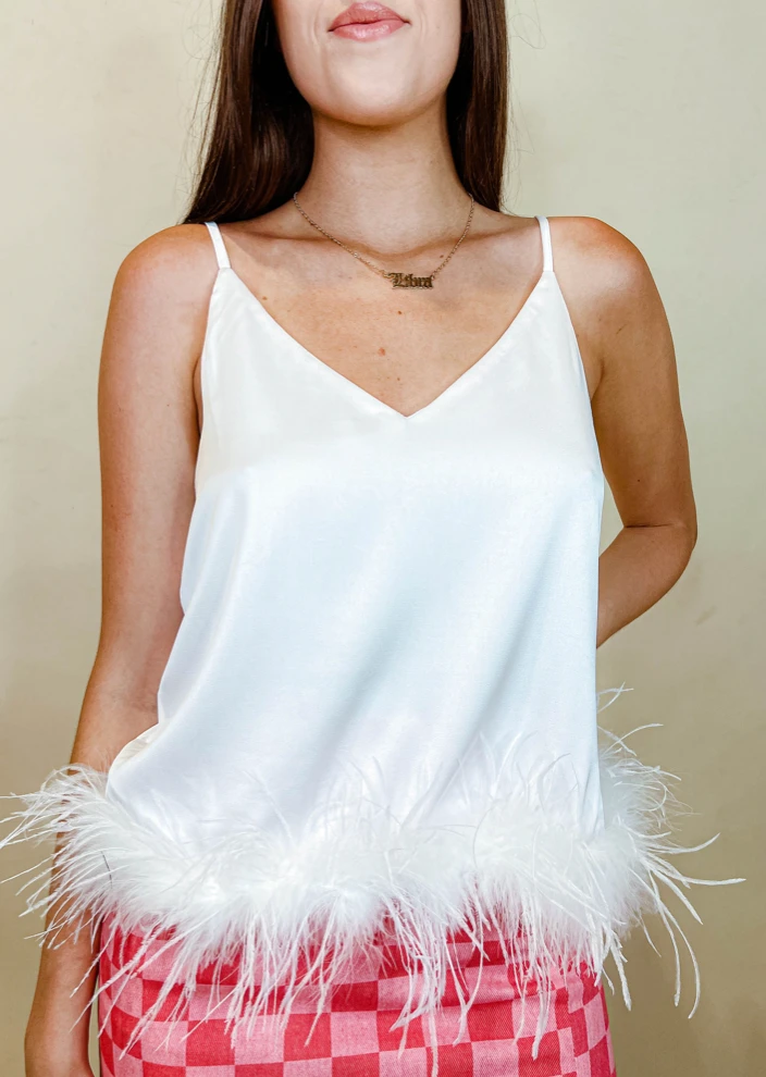 The Nova Feather Trim Top features adjustable spaghetti straps, a trendy feather trim detail at the bottom hem, and a relaxed fit. The Nova top is a super lightweight satin material – perfect for a summer night out! Pair with fun accessories to easily create the cutest trendy look!