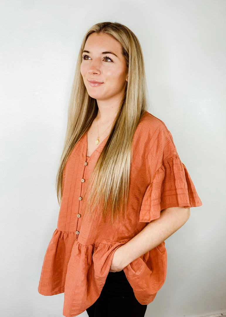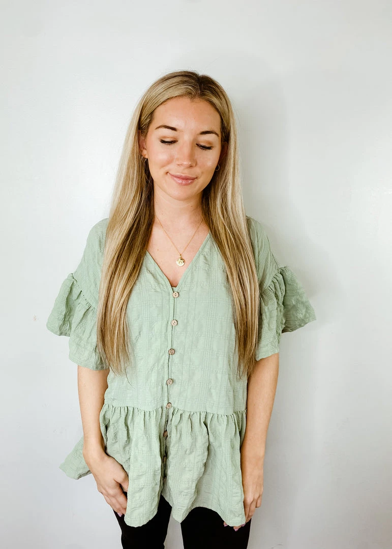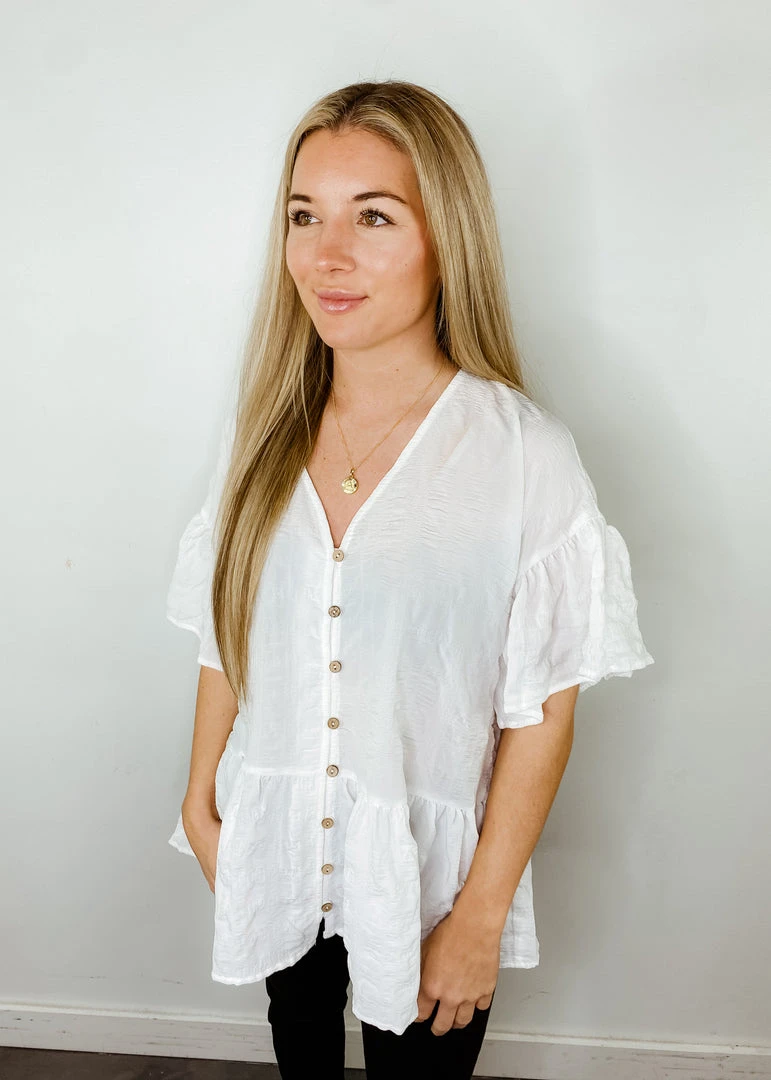 The Quinn babydoll top features a functional button up front, short ruffle sleeves, and a peplum babydoll silhouette. This top is a super lightweight, embossed fabric that is perfect for spring and summer! Pair the Quinn top with your favorite on trend accessories to easily complete the cutest look.