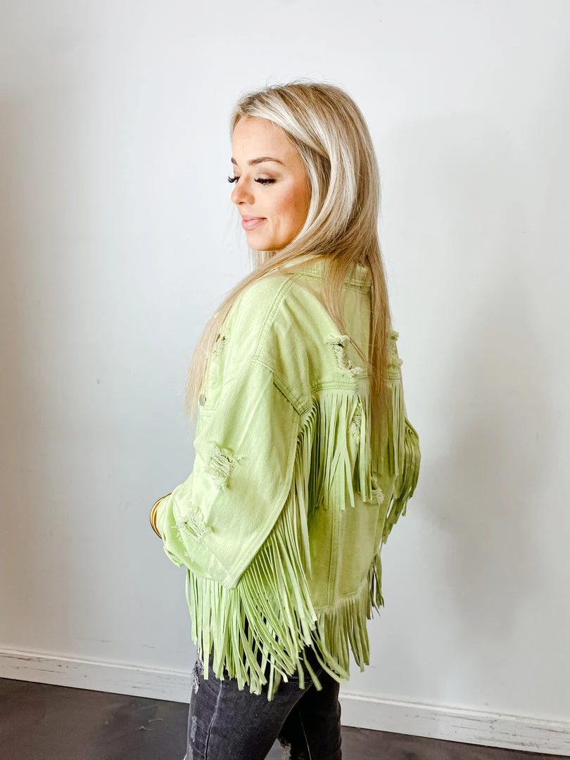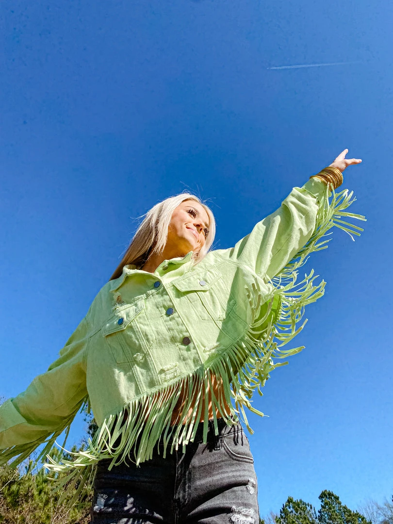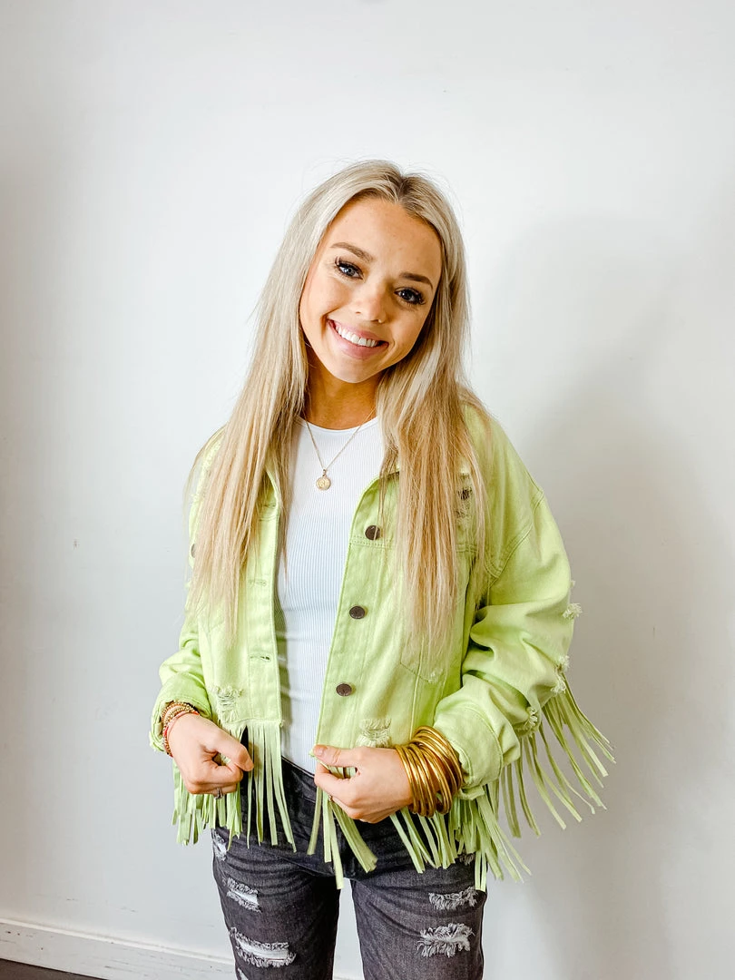 - Elevate your wardrobe with the Fantastic Fawn West Coast Fringe Denim Jacket. This stylish jacket features a unique fringe design, inspired by the laid-back West Coast vibe.