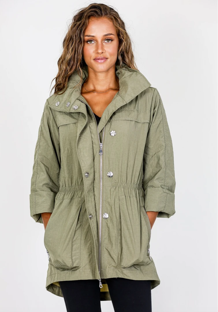 Large zippered pockets keep your valuables safe and secure during any kind of outdoor activity. Keep your jacket closed tightly with the front zipper, or use the stylish snaps for a quick close that is easy to undo. Never fear having the small of your back or your belly exposed in cool weather, as this trendy winter jacket is long enough to cover your waist against the elements.