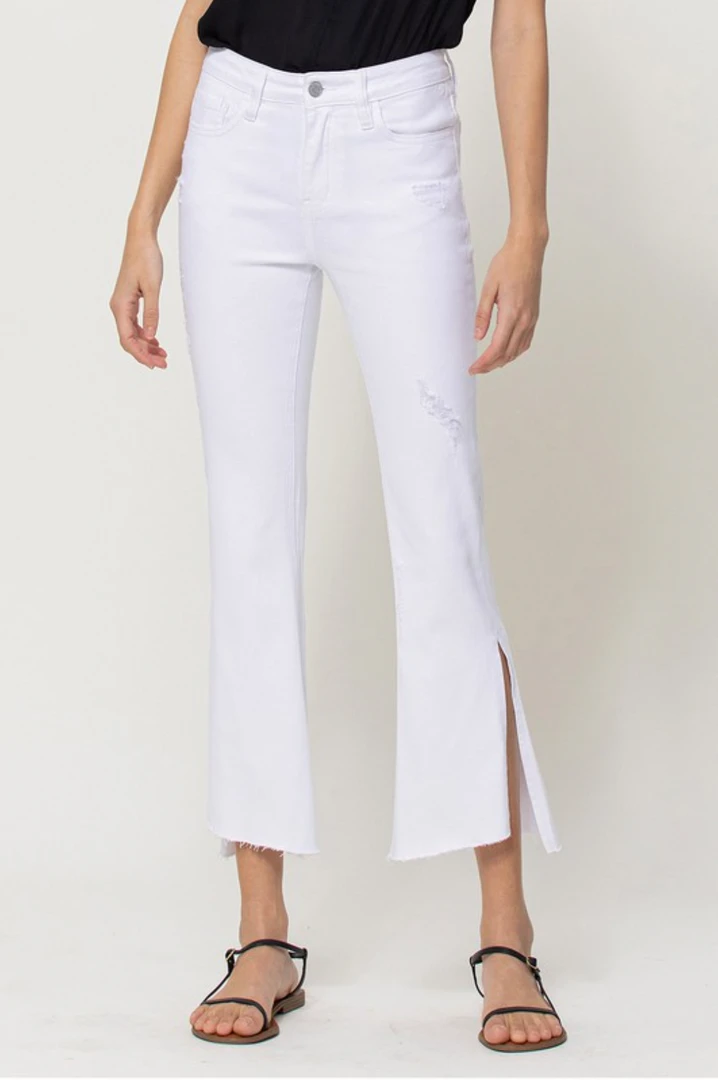 The Isabella Kick Flare Jeans will be on repeat all summer long! These white jeans feature a flattering mid rise waist, subtle distressed accents, and a slightly cropped kick flare hem with a side slit detail. Easily pair the Isabella jeans with any top in your closet!Â