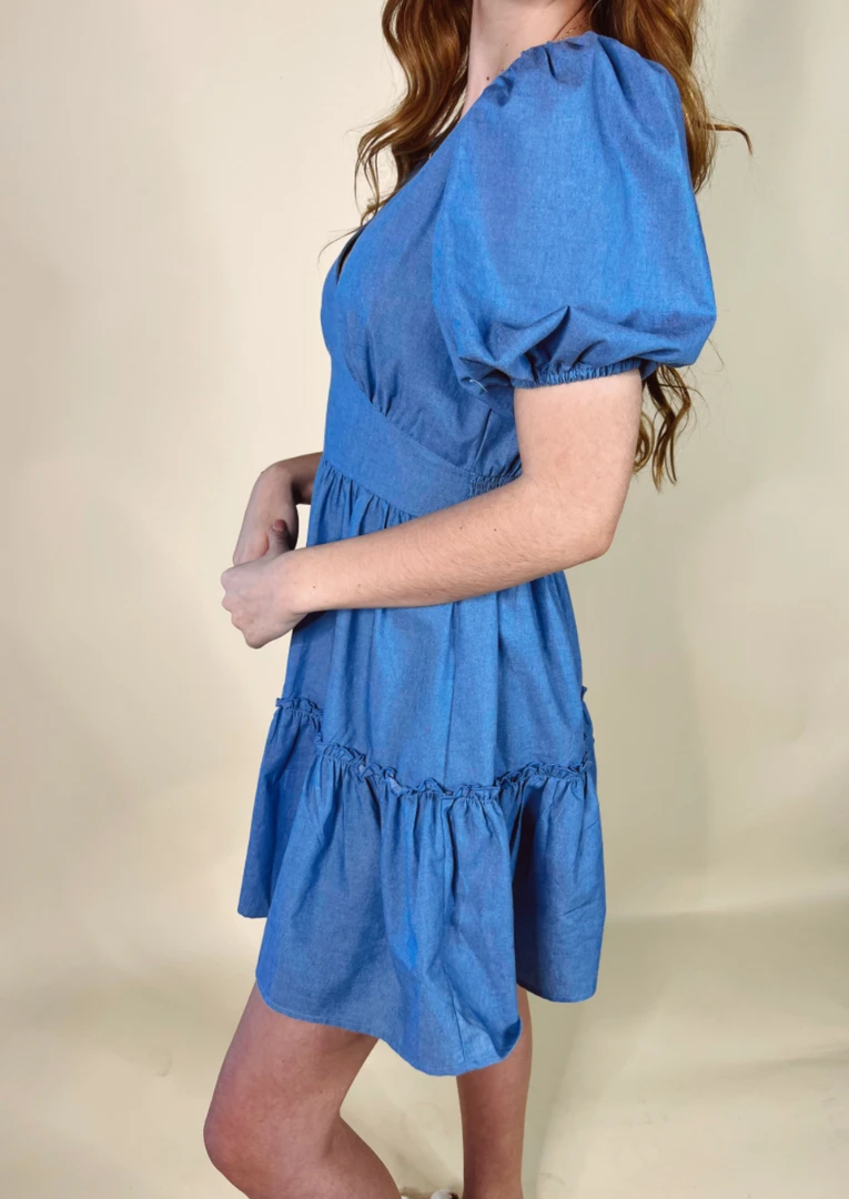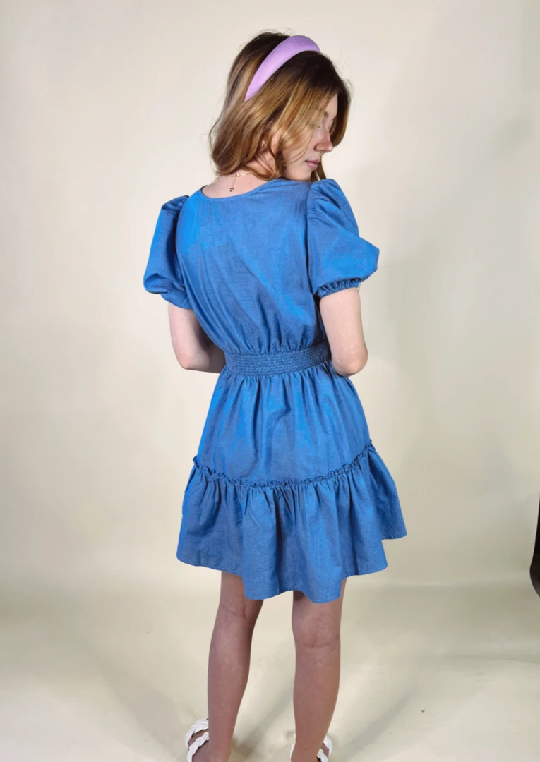 The Blakely dress features a v neckline, short bell sleeves, a flattering yoke detail at the waist with smocked band on the back, and a tiered silhouette with a ruffle at the hemline. We recommend pairing the Blakely dress with trendy accessories and strappy sandals!