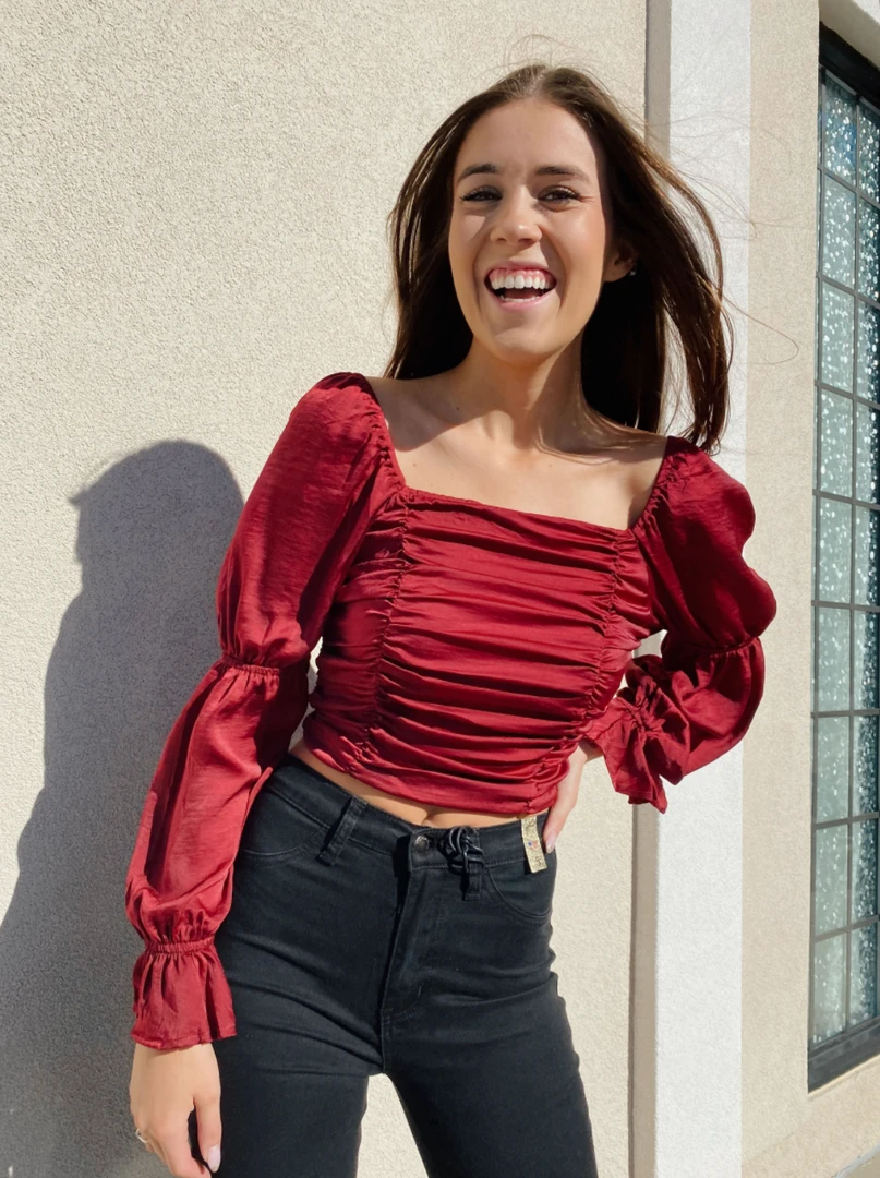 - Elevate your style with the Glam Tops Mabry Ruched Long Sleeve Blouse. Featuring a flattering ruched design, this top is perfect for both casual and formal occasions.