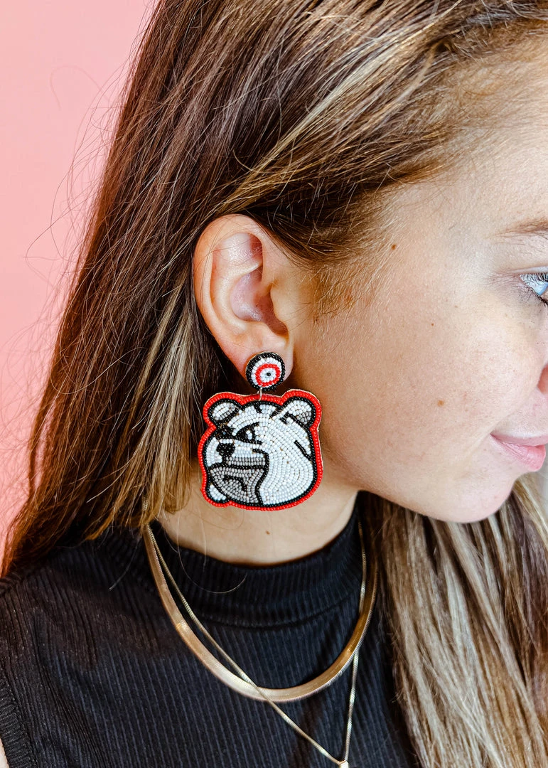 - Show your team spirit with the Golden Stella Beaded Bulldog Earrings from our exclusive Game Day Collection. These stylish earrings are perfect for any fan looking to add a touch of elegance to their game day outfit.