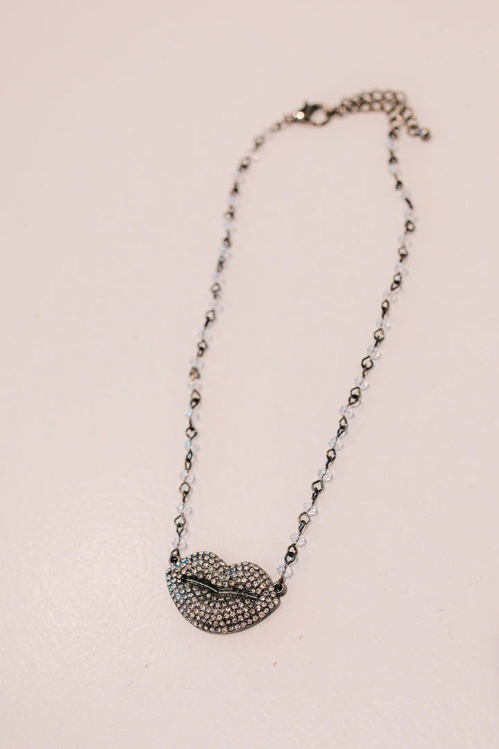 Lip necklaces are SO on trend this season. This color combo comes in 3 options in gold/clear beaded, gun metal/clear beaded, and gun metal rainbow beaded.