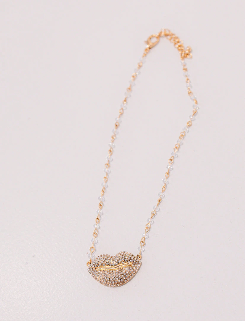 - Elevate your style with the Golden Stella Glass Bead Link Crystal Lip Necklace. This exquisite piece features a unique lip-shaped pendant adorned with sparkling crystals, making it a perfect accessory for any outfit.