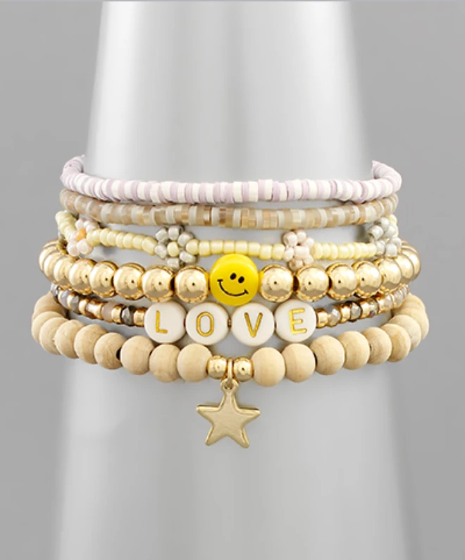 - Elevate your style with the Golden Stella Jewelry Beaded Smiley Bracelet Set. These trendy beaded bracelets feature charming smiley face charms, perfect for adding a playful touch to any outfit.