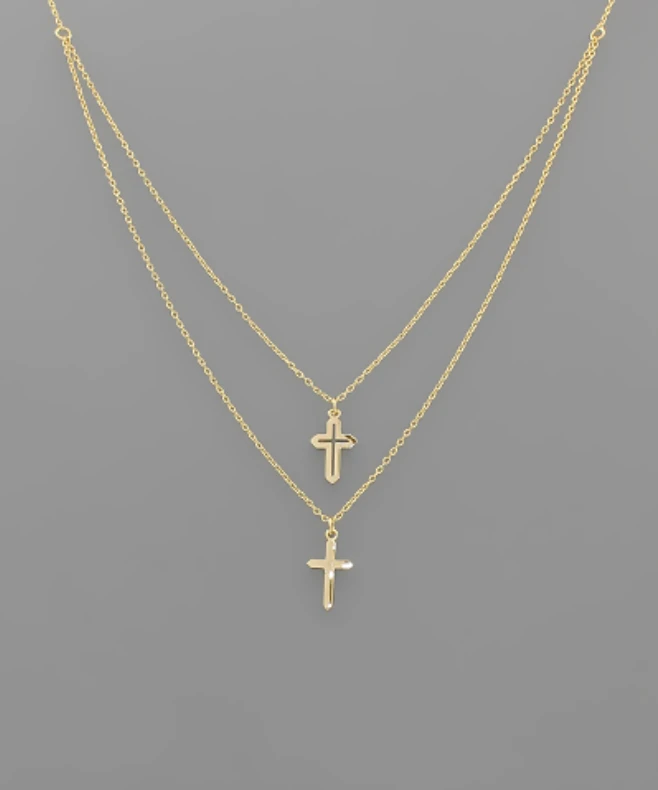 - Elevate your style with the Golden Stella Layered Cross Charm Necklace. This elegant piece features a delicate layered design with a charming cross pendant, making it a perfect accessory for both casual and formal occasions.