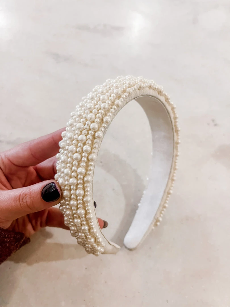 This cream headband is covered in pearls and goes with an outfit that you have in your closet!