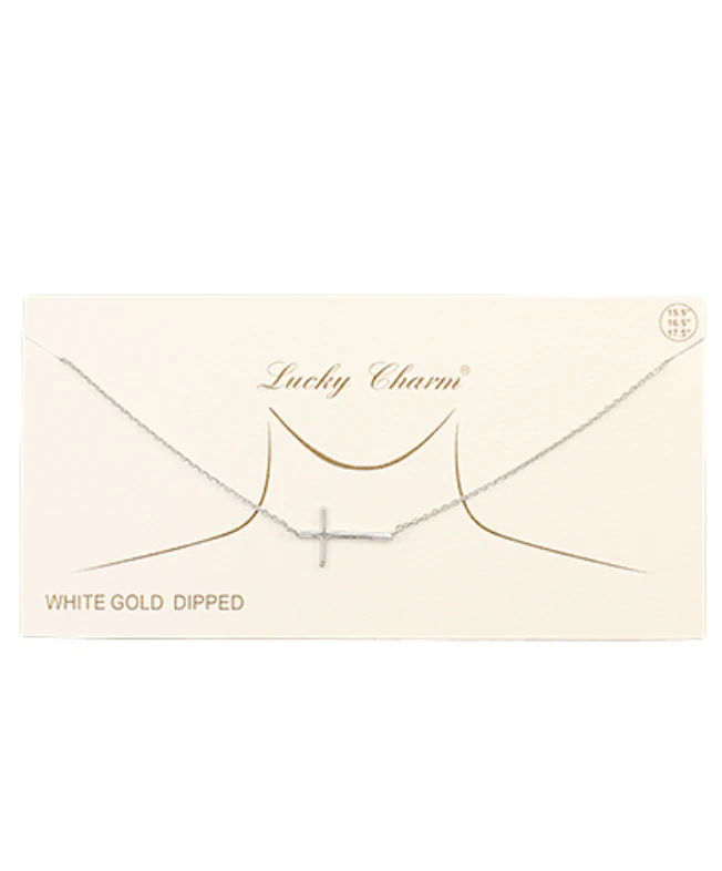 - The Golden Stella Sideways Cross Charm Necklace is a beautifully crafted piece of jewelry, featuring a unique sideways cross design that adds a touch of elegance to any outfit.