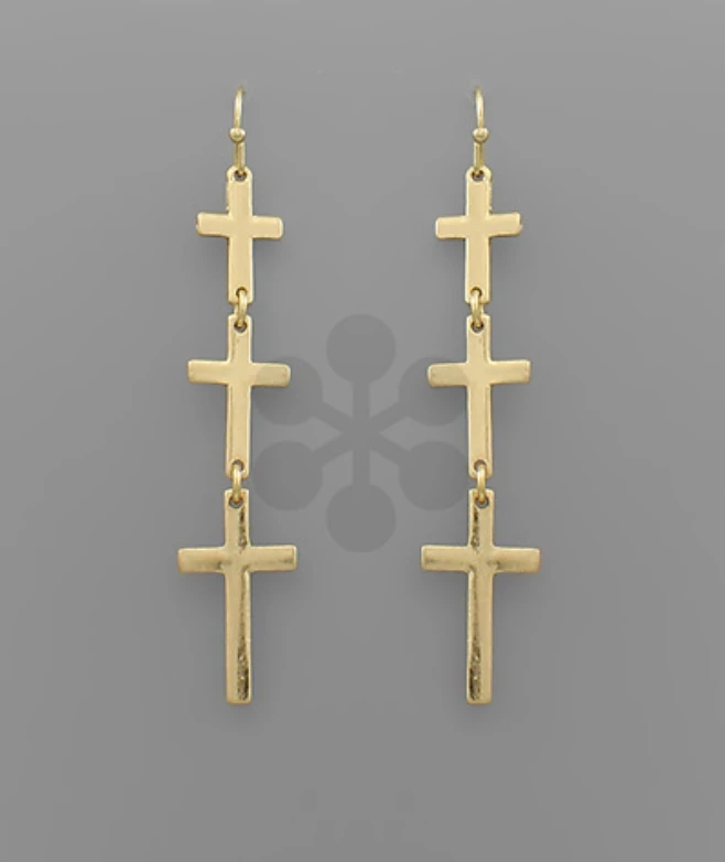 - Add a touch of elegance to your jewelry collection with the Golden Stella Triple Cross Earrings. Perfect for gifting or treating yourself, these earrings are a must-have for any fashion-forward individual.