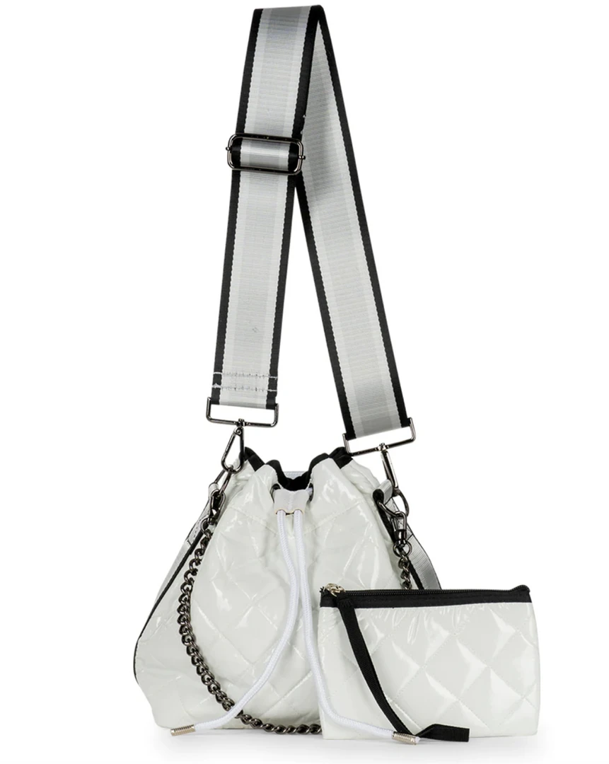 - White Quilted Puffer / Chain / Black Silver White Striped Straps