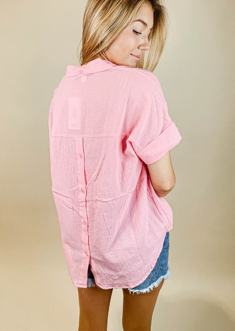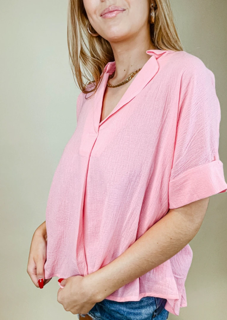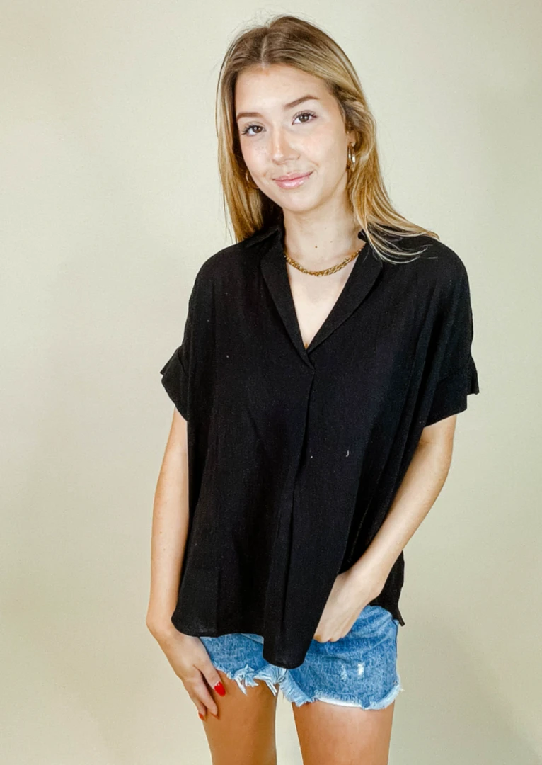 The Lucky Charm Flowy Blouse features a collar at the neckline, short sleeves with folded cuffs, a super flowy fit, and a button up accent on the back. Easily dress the Lucky Charm blouse up or down! We will be tucking it into our favorite denim shorts.Â