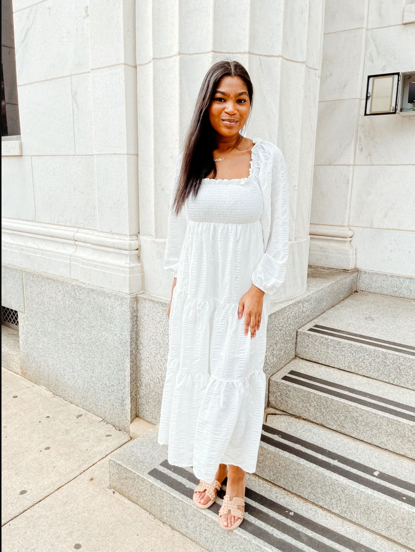 You just can’t go wrong with the Montana Smocked Midi Dress for spring! This dress features a flattering square neckline, long sleeves with elasticized cuffs, a flowy tiered ruffle silhouette, and a self tie detail on the back. Perfect for bridal events, Easter, and other spring festivities!Â