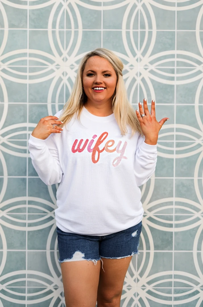 Calling all wives and brides to be! This corded sweatshirt is perfect for bridal showers, bachelorette parties, etc. It makes the cutest gift! This corded sweatshirt features a colorful, cursive ‘wifey’ patch embroidered on the front and a relaxed, comfortable fit.Â