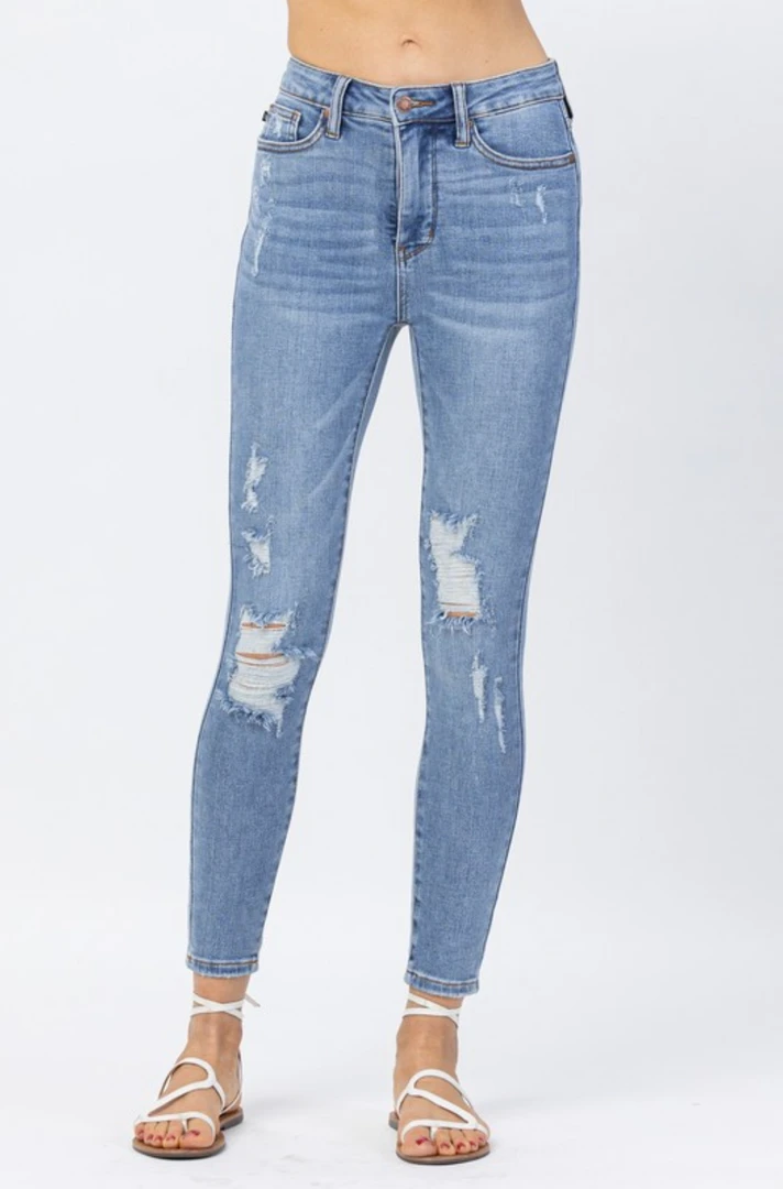 A good pair of distressed skinny jeans will always have a place in our wardrobe. The Leigh Distressed Skinny Jeans feature a high rise waistline with tummy control, distressed accents, and a flattering skinny fit. You can easily pair the Leigh jeans with any top in your closet! Fit is true to size.Â