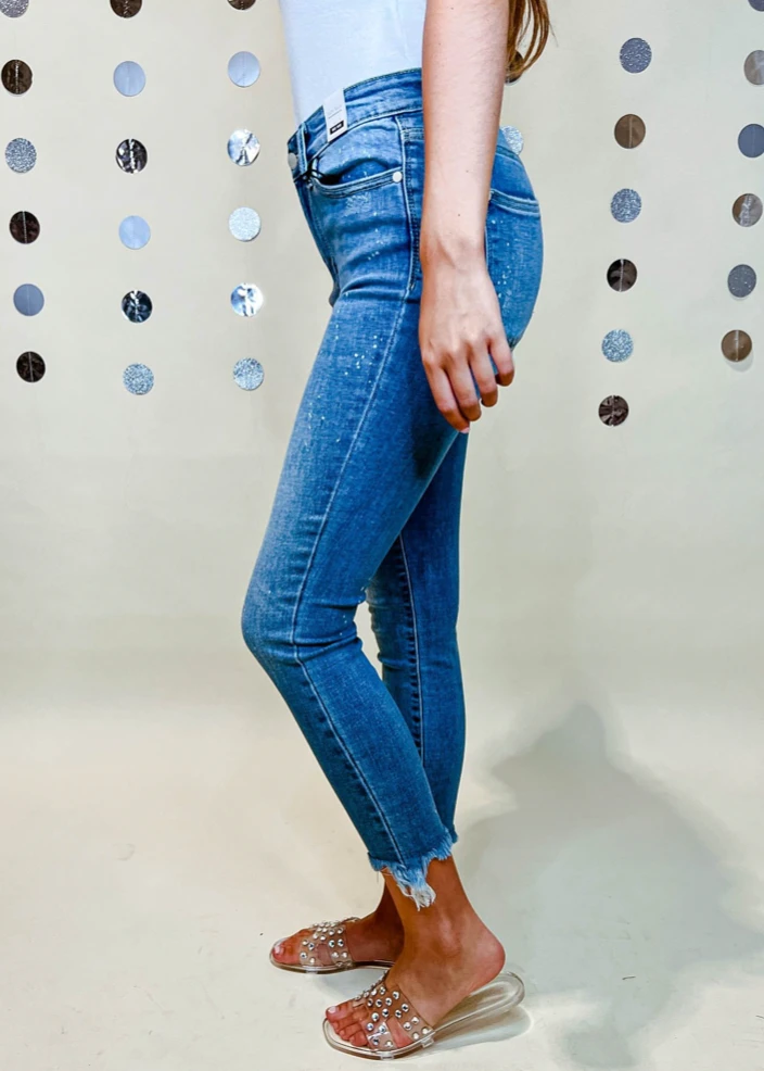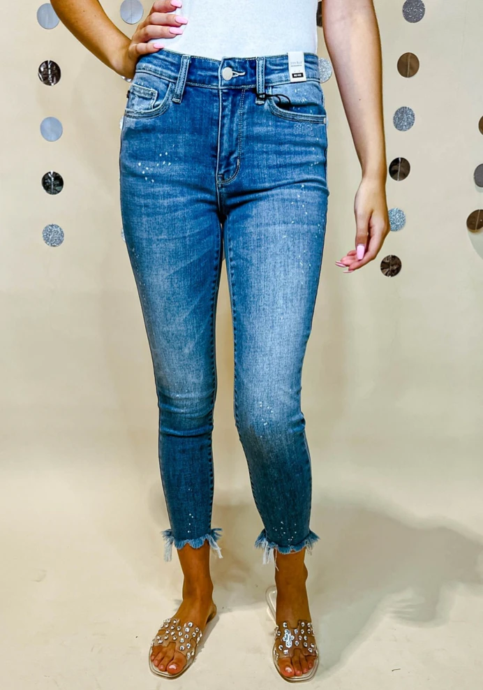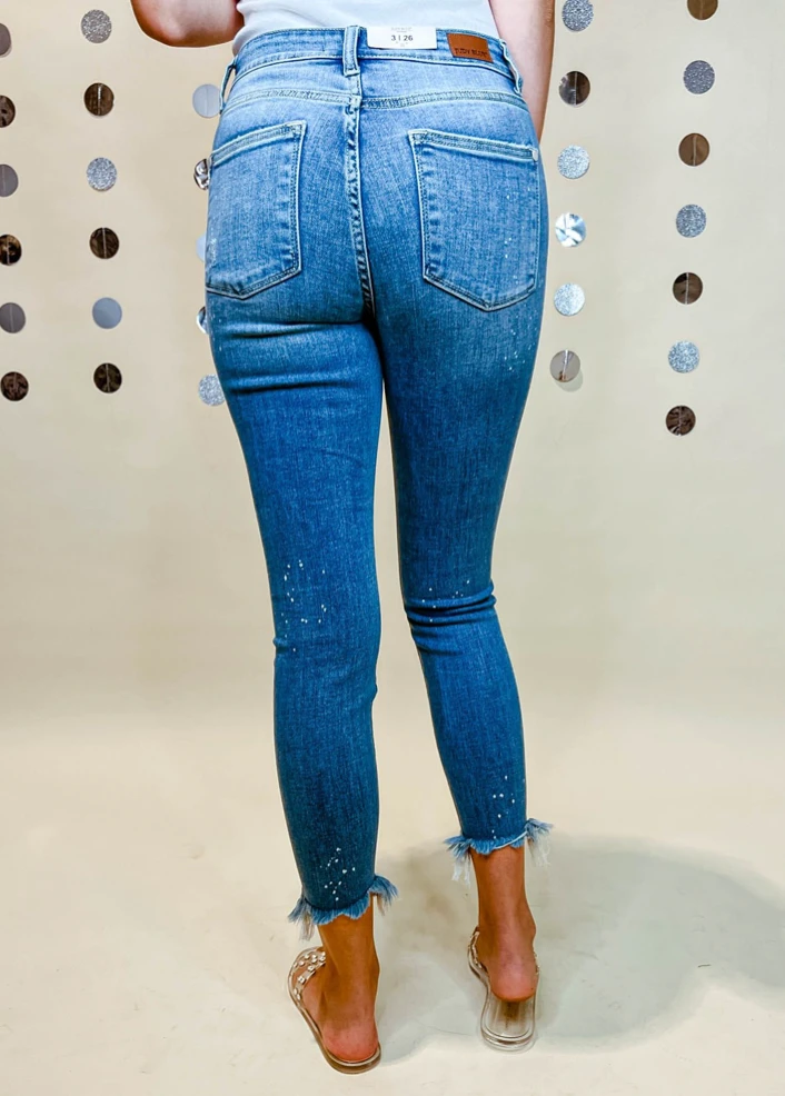 The McKayla Frayed Hem Skinny Jeans feature a flattering mid rise waist, subtle bleach splash details, and super skinny fit, and a frayed bottom hem. Easily pair the McKayla jeans with any top in your close through all seasons! Fit is true to size.Â
