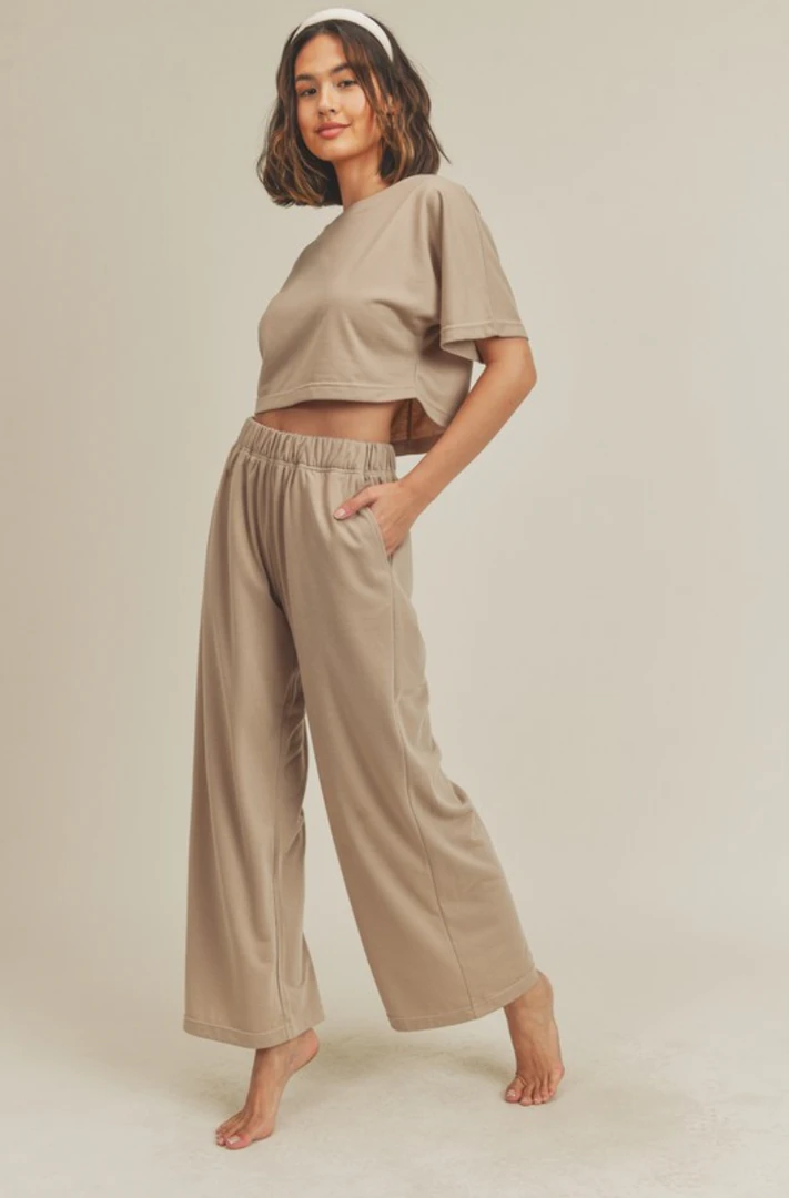 The Sarah pants are a super soft french terry material – you’ll want to live in them! These pants feature a high rise waist, pockets at the side, and wide legs. Pair these pants with the Sarah Soft Crop Top!
