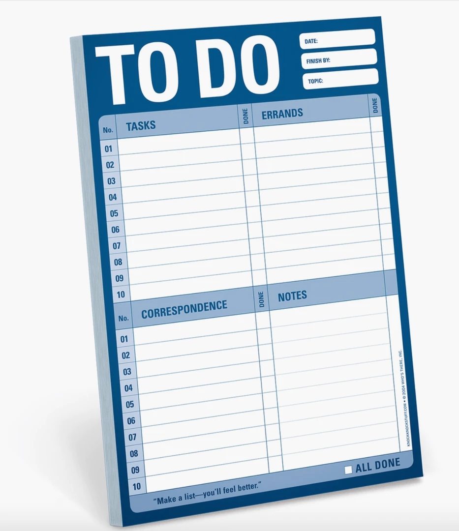 - Stay on top of your daily tasks with the Knock Knock Lifestyle To Do Classic Notepad. Its sleek design and practical layout make it the perfect companion for organizing your day.