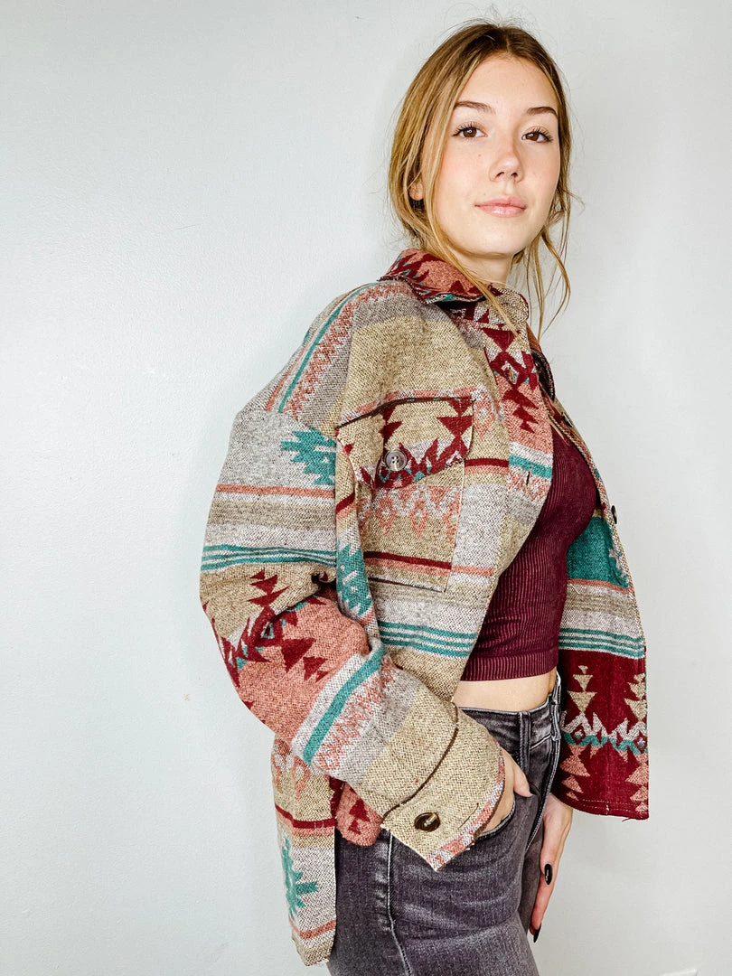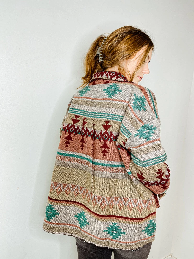 - Elevate your wardrobe with the La Miel Dakota Aztec Print Jacket, featuring a unique Aztec-inspired design that adds a touch of cultural flair to your outfit.