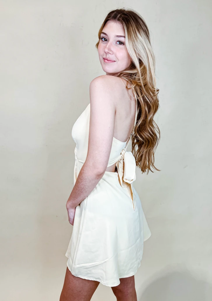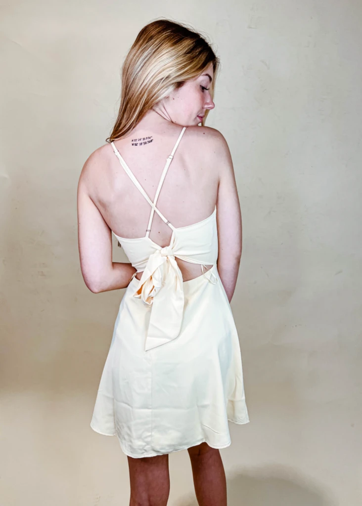 The Mallory Open Back Dress is perfect for any upcoming summer special occasion! The Mallory dress features adjustable spaghetti straps, an open back with a self tie bow, a wrap style top, and a flattering fit and flare silhouette. Pair the Mallory dress with your favorite accessories and strappy shoes!