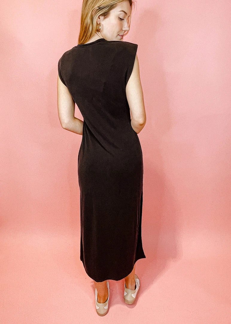 The Monica Sleeveless Midi Dress features a flattering sleeveless silhouette with a trendy shoulder pad accent, a super flattering slim fit, and a side slit detail. The Monica dress will is definitely one that you will wear over and over again! This dress is a lightweight, breathable modal fabric.Â