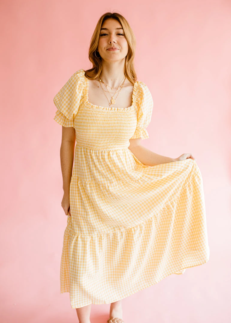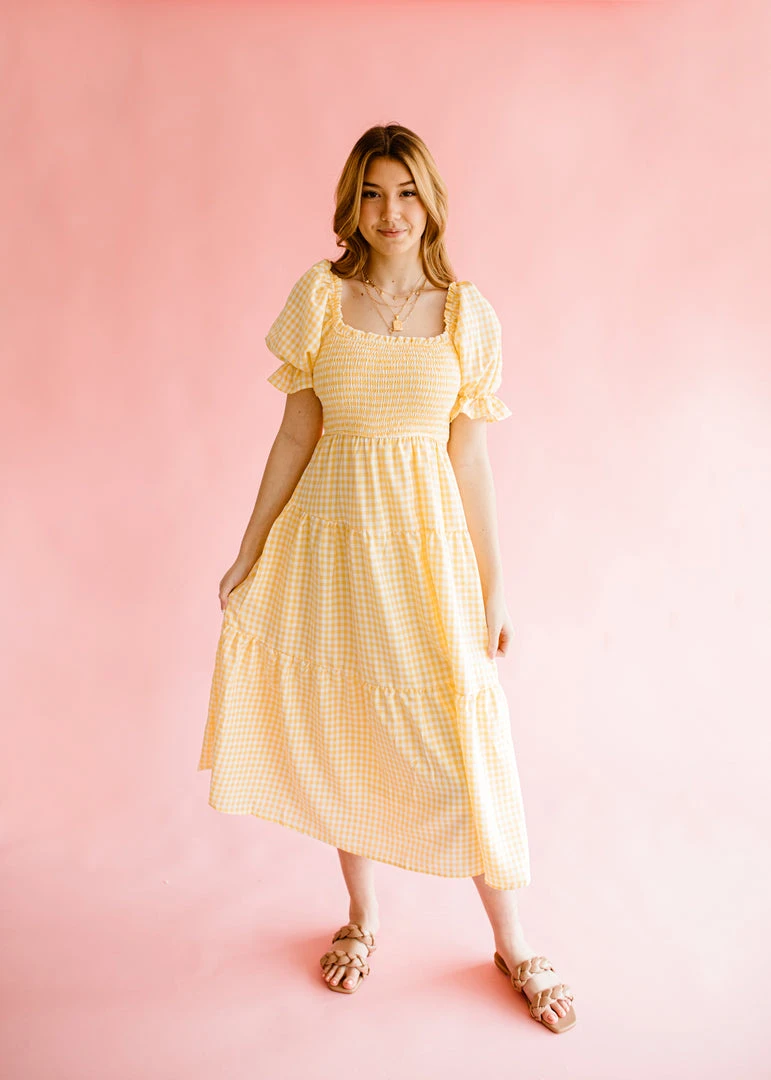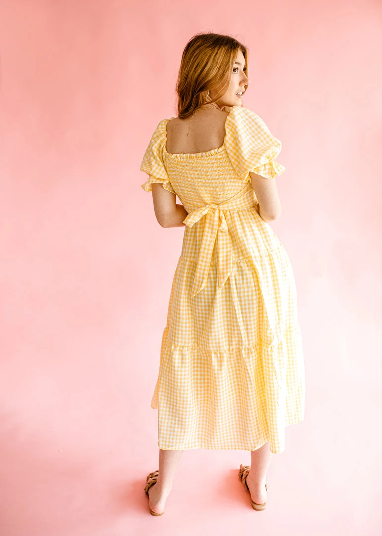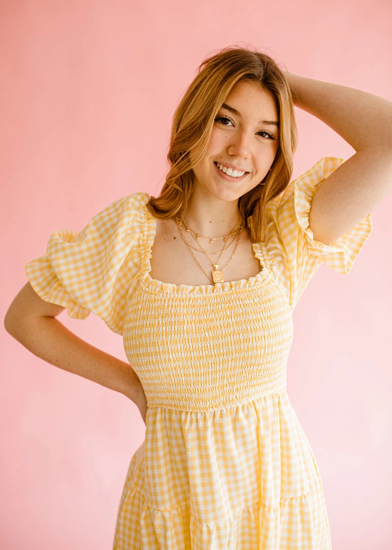 The Finley dress features an all over classic gingham pattern, a flattering square neckline, smocked bodice, short puff sleeves with elastic cuffs and a ruffle hem, a self tie accent on the back, and a tiered ruffle silhouette. This dress is lined and has pockets on the side.Â