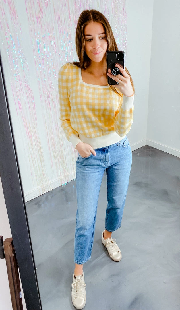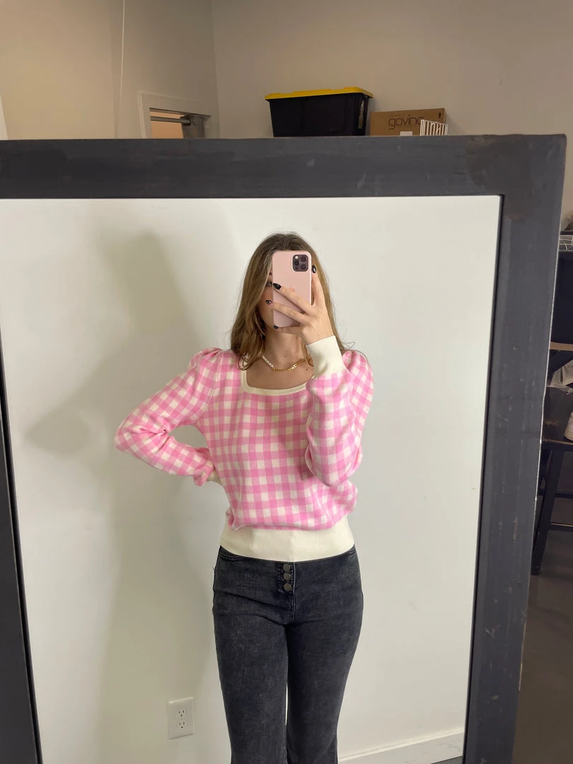 - Elevate your casual wardrobe with the &Merci Penelope Gingham Sweater Tops. Featuring a chic gingham pattern and long sleeves, this knit top is perfect for layering or wearing on its own.