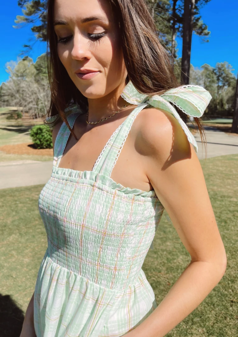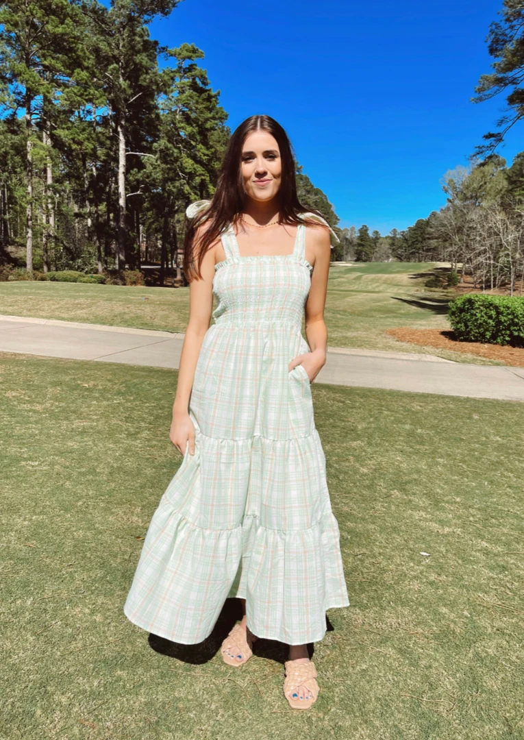 The Theresa Plaid Midi Dress features a multicolor plaid pattern, wide adjustable tie straps with lace trim, a stretchy smocked bust, pockets at the side, and a tiered ruffle silhouette. We’re obsessed with the Theresa dress at Swank – it’s perfect for so many different events, dressy or casual!Â