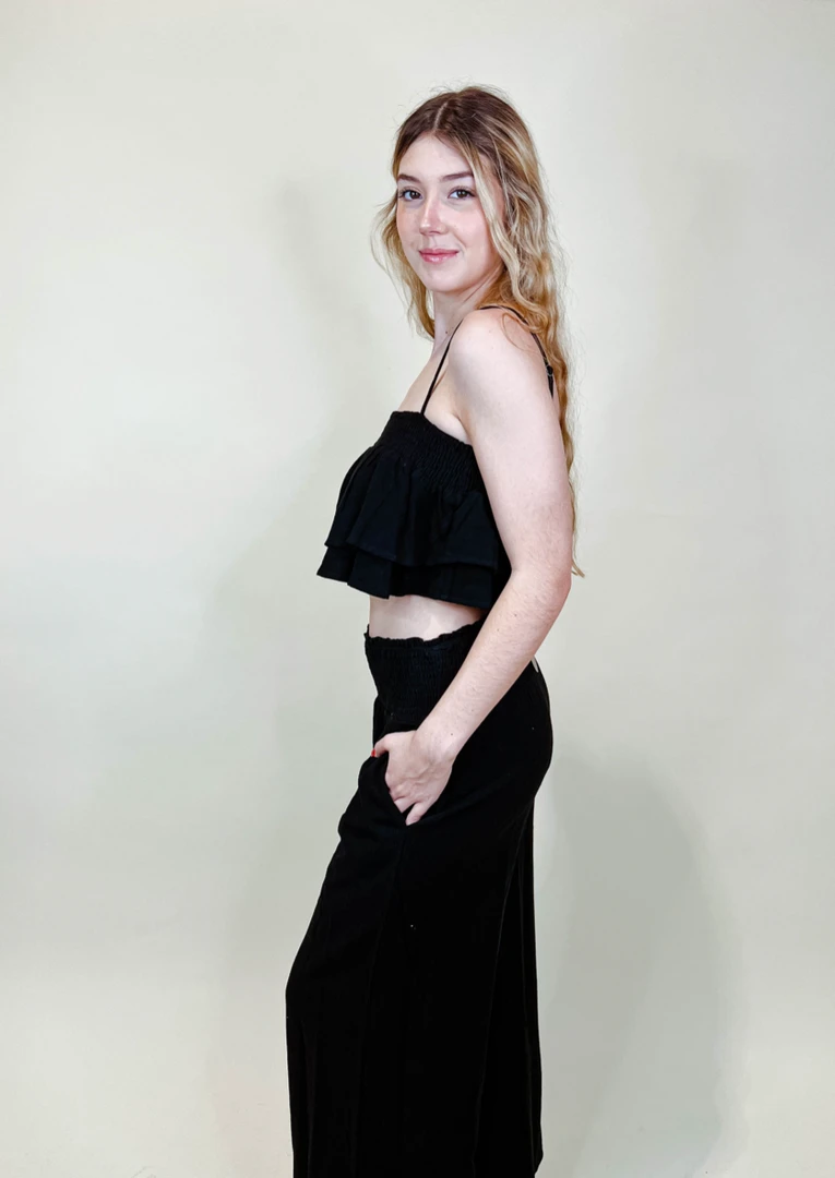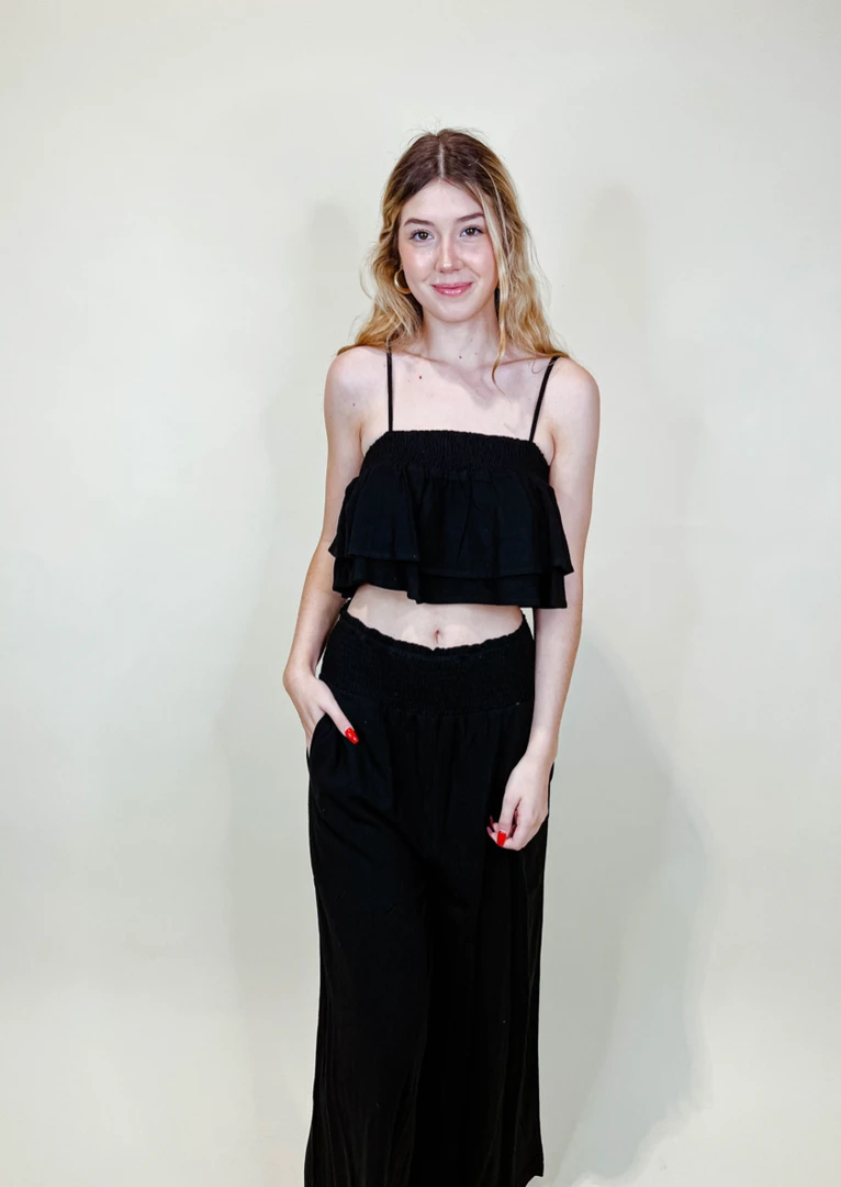 The Hunter Two Piece Set features a crop top with adjustable spaghetti straps, a smocked trim, a cute layered ruffle silhouette, and a self tie detail on the back. The Hunter set includes wide leg pants with a high rise smocked waist, pockets on the side, and a relaxed fit.Â