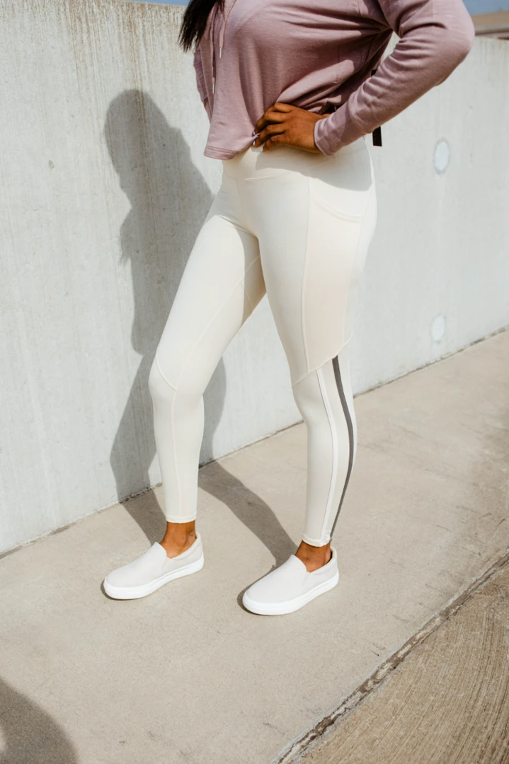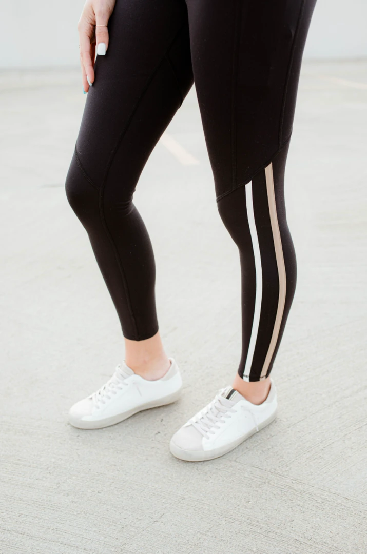 - Experience ultimate comfort with our Mono B Pocket Panel Striped Leggings. Designed with a high-waisted fit and soft, stretchy fabric, these leggings are perfect for athleisure and loungewear.
