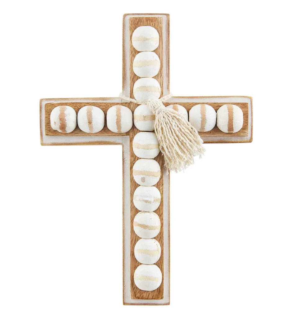 Complete your gallery wall with the Medium Wood Bead Cross. The beaded mango wood cross features a distressed finish and unique markings. The cross also features a tassel detail.Â