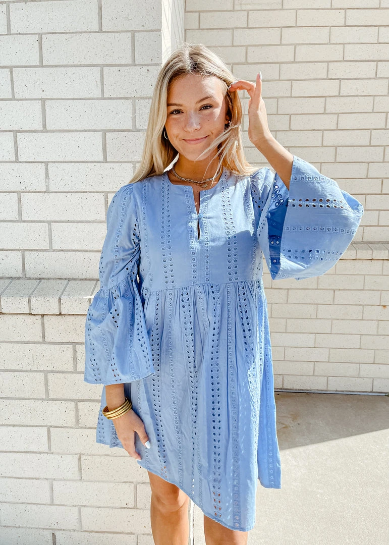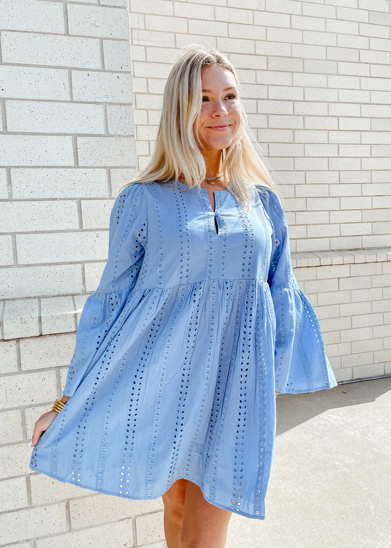 - This dress is available in a stunning blue color that complements any skin tone. The eyelet detailing adds a touch of elegance, making it a versatile piece for various events.