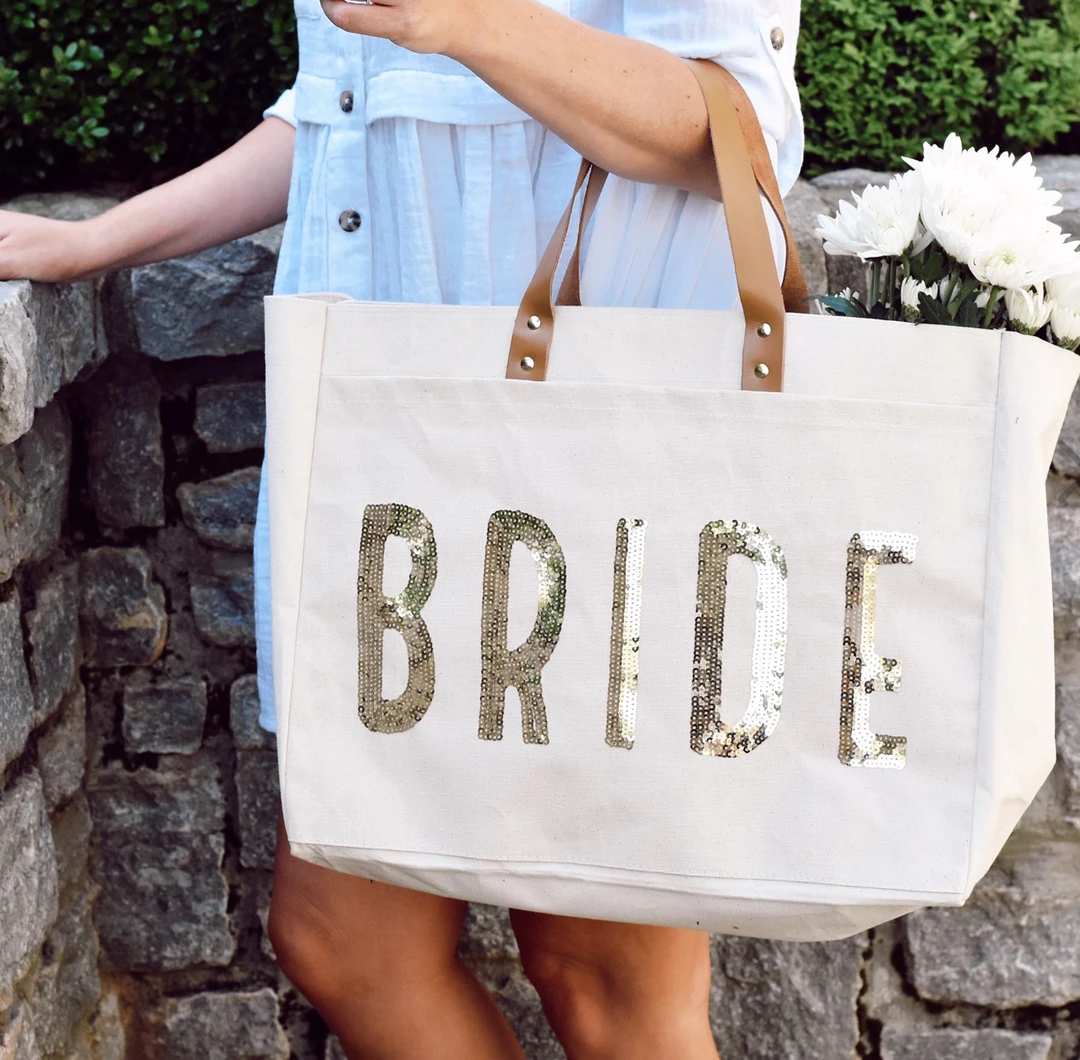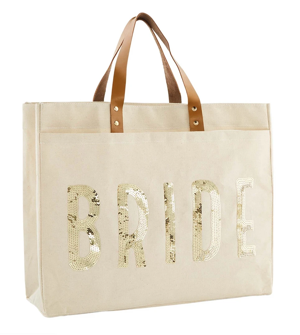 The Sequin Bride Tote Bag is an essential for any bride to be! The canvas tote bag features sequin lettering that reads “Bride” in gold. It also has genuine leather handles and exterior pockets. The tote bag measures 14 1/4″ x 18″ and is made from jute fabric. This is a great gift for Bridal showers and Bachelorette parties.Â