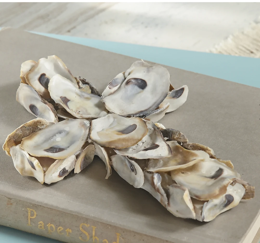 Hand-crafted layered natural oyster shell cross structure. Use as Decorative coffee table piece or mount on wall. Arrives with hardware for hanging. Staying at a friends beach house this Summer? Give as a thank you or housewarming gift!Â
